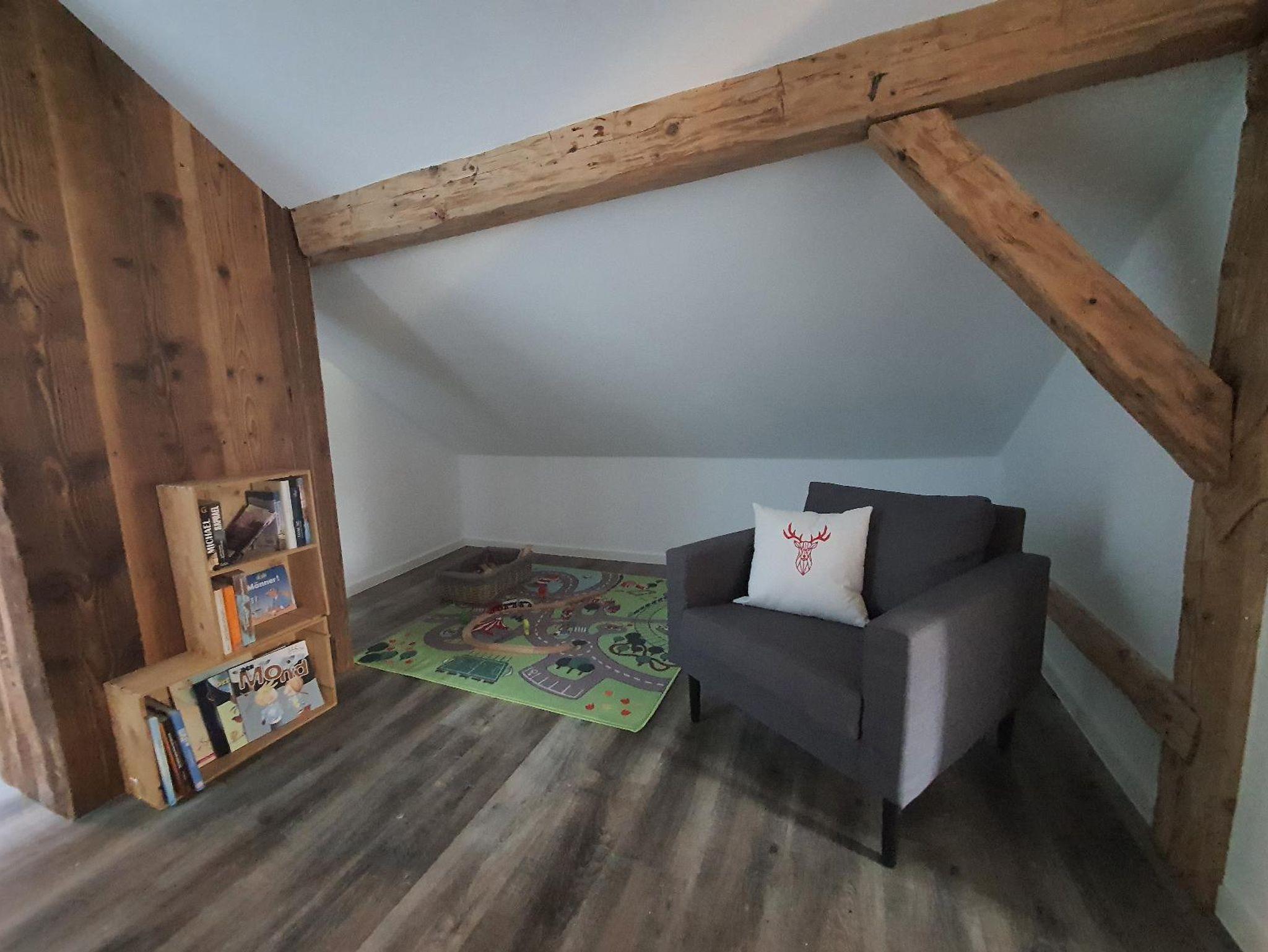 Spielecke, Spiele, Holzeisenbahn, Babybett und Hochsitz