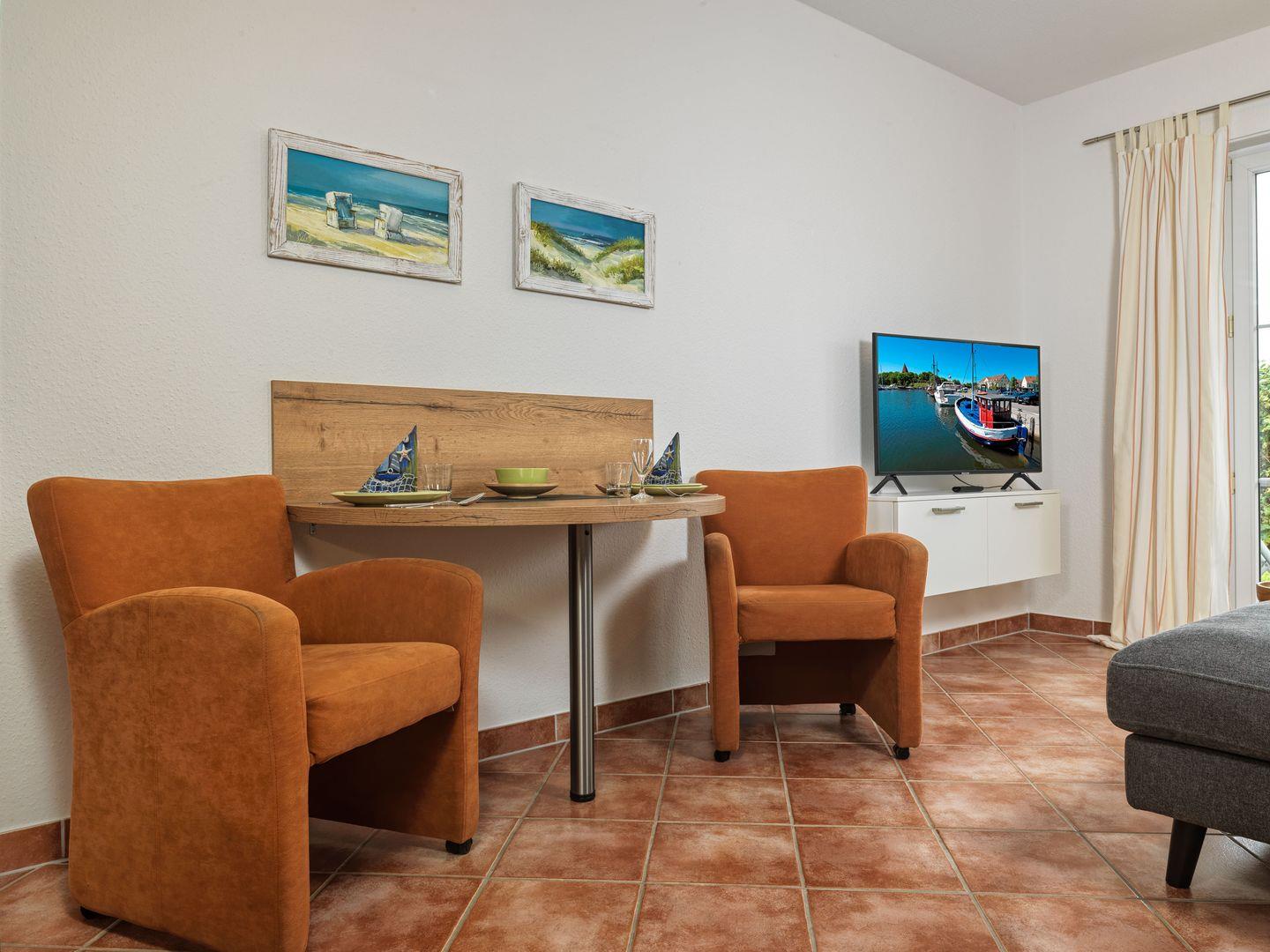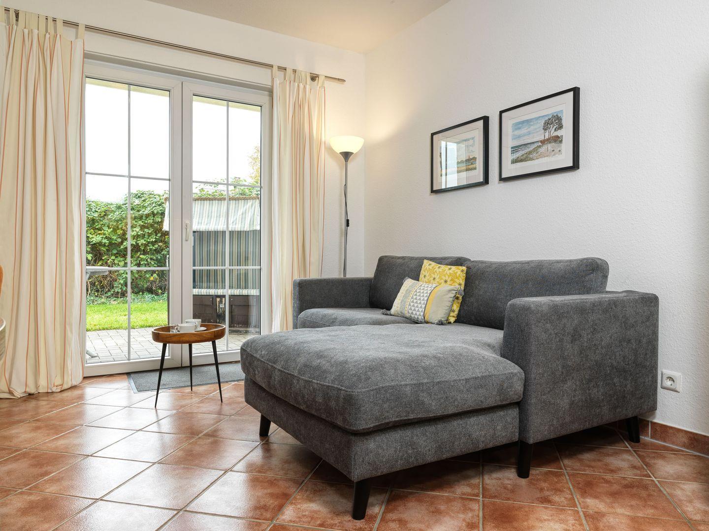 Das Wohnzimmer mit einer gemütlichen Couch, Fernseher und einer schönen anschließenden Terrasse mit Strandkorb, rundet Ihren Urlaub ab. Von der Terrasse aus haben Sie