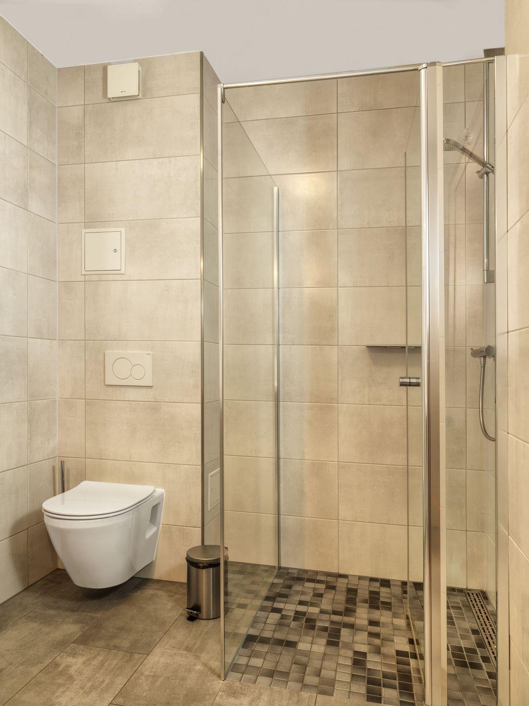 Das Bad verfügt über WC, Dusche und Waschbecken.