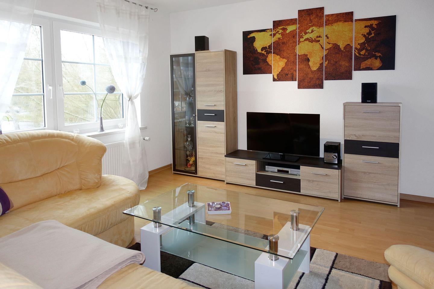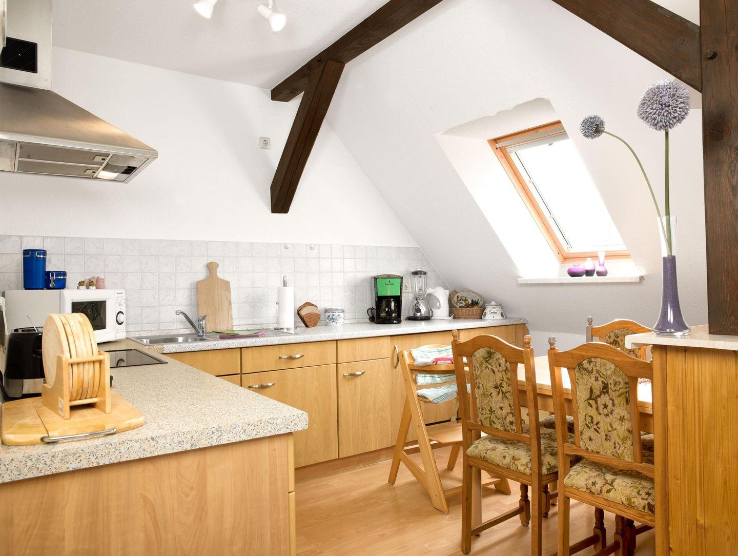 In dieser gemütlichen Dachgeschosswohnung erwartet Sie ein helles Wohnzimmer mit Küchenzeile und Essbereich. Ein Flach-TV sowie eine Anlage mit Radio-/CD-/DVD Player stehen für Ihre Unterhaltung bereit. Außerdem befindet sich hier ein Schlafzimmer mit Doppelbett sowie ein Schlafzimmer mit 2 Einzelbetten. Ein Bad mit WC und Dusche ist ebenfalls im OG zu finden.