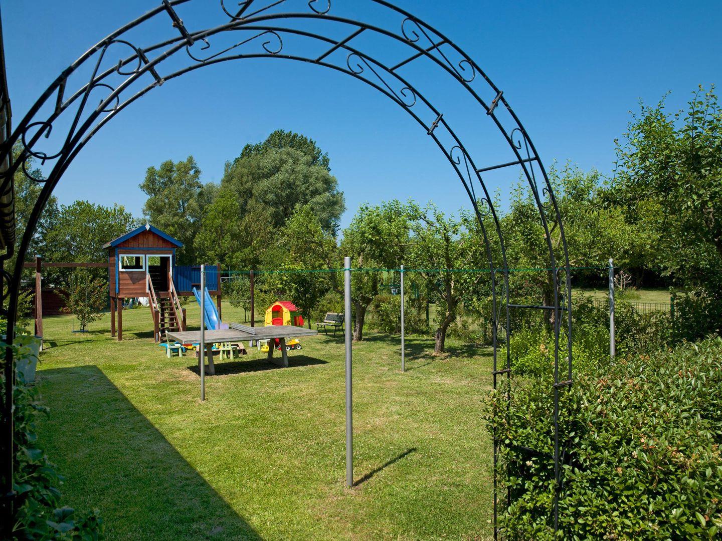 Ideal für Familien: Großer Garten zur Mitnutzung mit Strandkorb, Liegen, Spielhaus, Rutsche, Sandkasten, Schaukel und Grill.