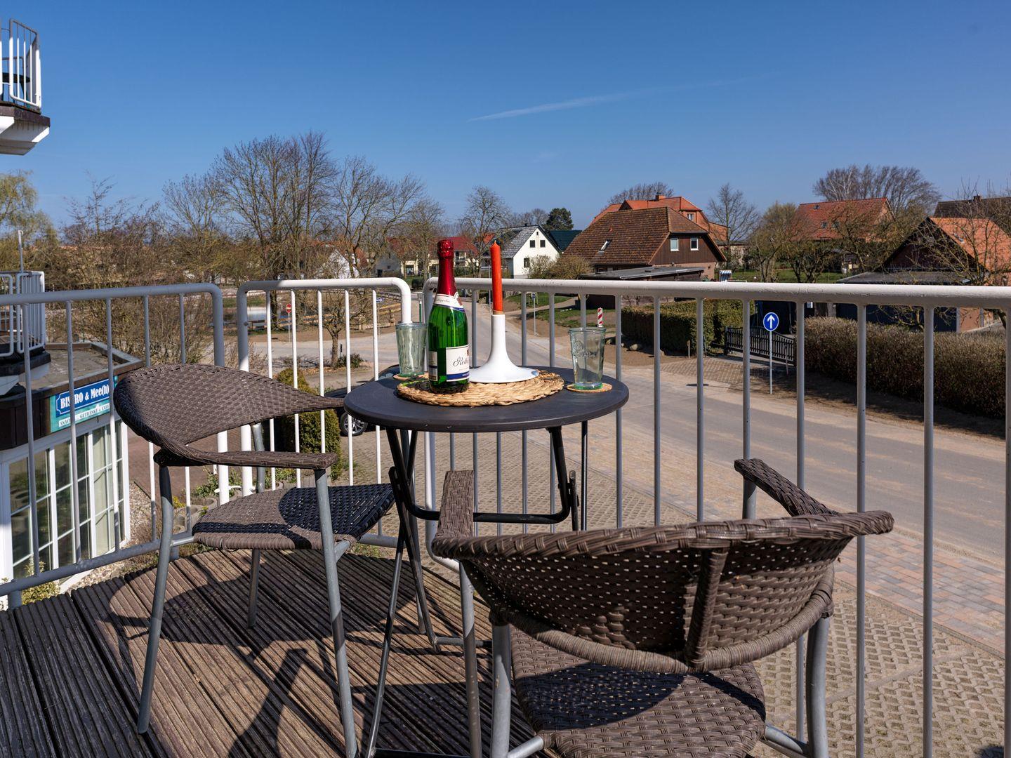 Von hier gelangt man auf den schönen Balkon, mit weitem Blick über das Haff und die Landschaft.