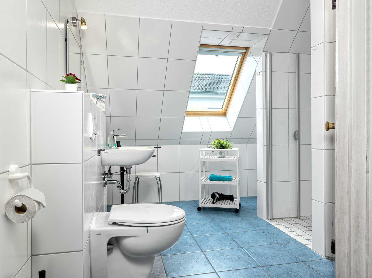 Ein Duschbad mit WC ist im Erdgeschoss und ein weiteres großes Bad mit Sauna, Dusche und WC im Obergeschoss verkürzt die kalten Tage.