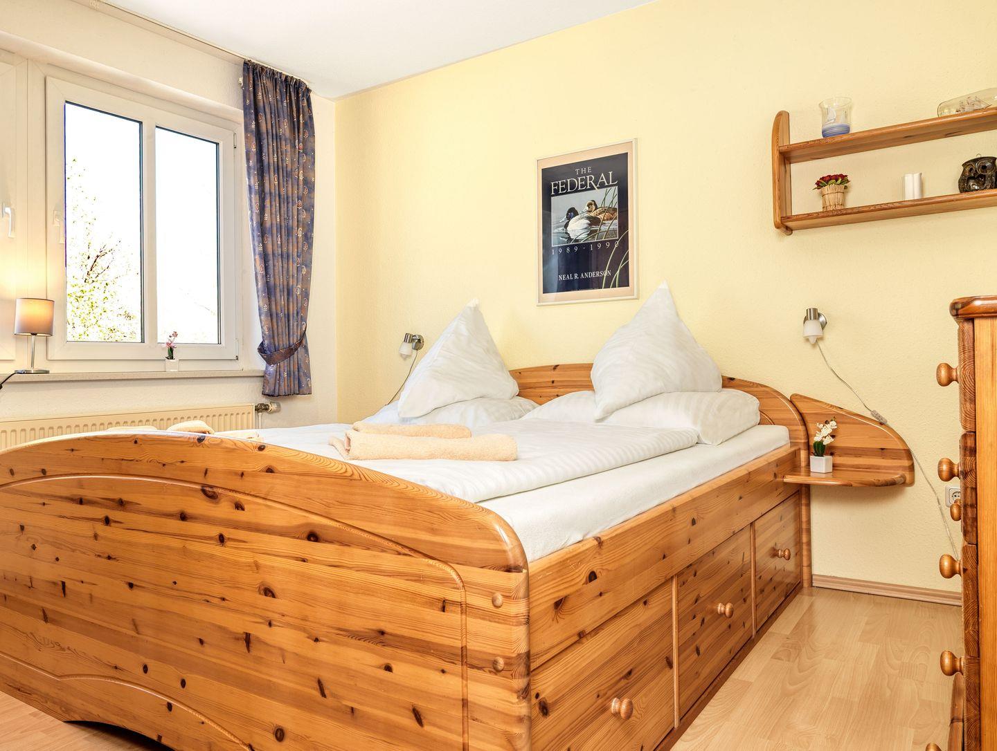 Ein Wohnzimmer mit großem TV, einem Schlafsofa und Essbereich erwarten Sie. Von hier können Sie direkt auf den Balkon mit Gartenmöbeln die Sonne genießen. Das Schlafzimmer ist mit einem Doppelbett und Kleiderschrank ausgestattet.