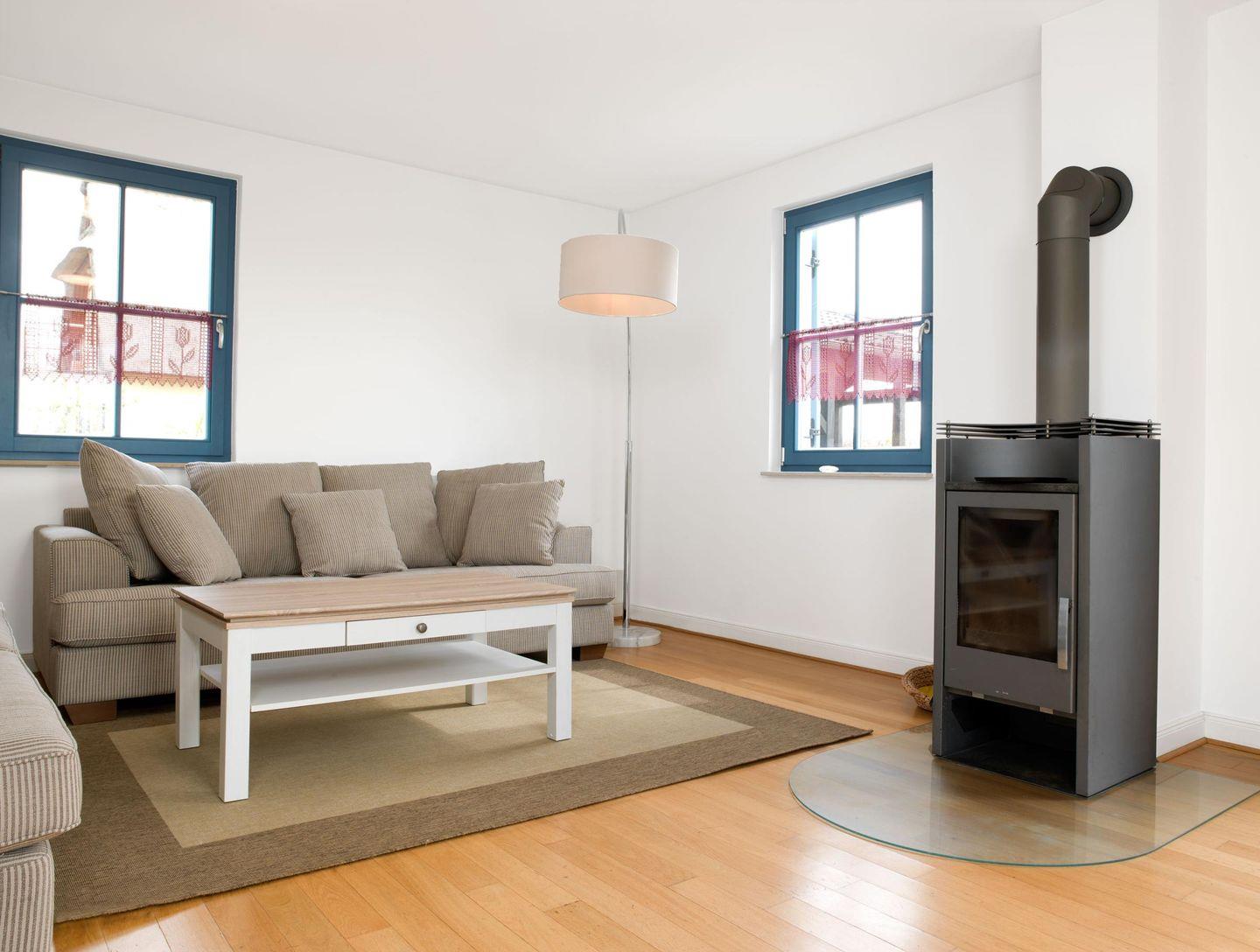 Im Erdgeschoss erwartet Sie ein großes, helles Wohnzimmer mit breiter Fensterfront und Blick ins Grüne und einem Kamin.
