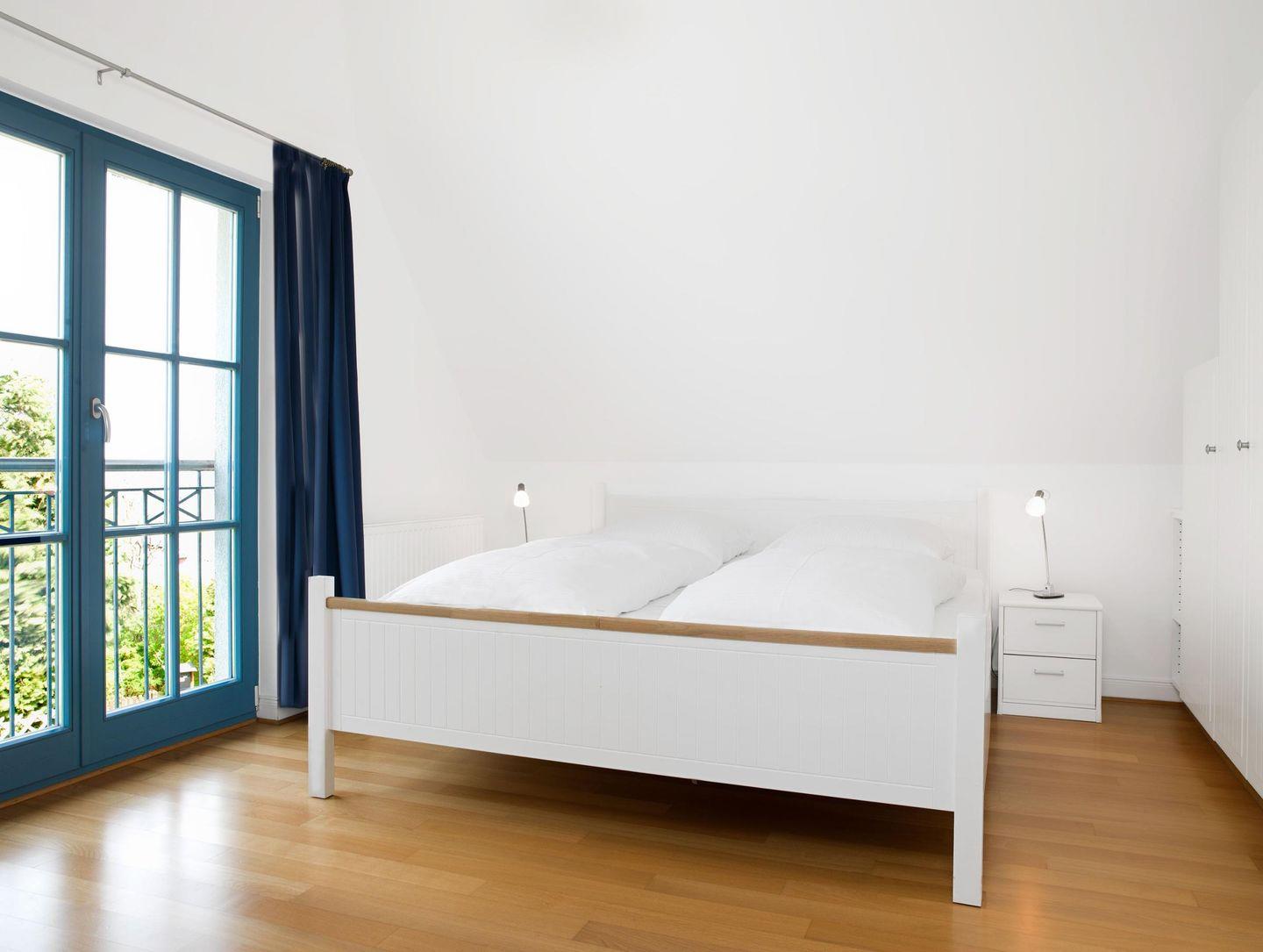 Im Obergeschoss finden Sie 2 Schlafzimmer, eines mit Doppelbett (1,80x2,00m) und Meerblick, eines mit zwei Einzelbetten (0,90x2,00m) und einem Kinderbett.