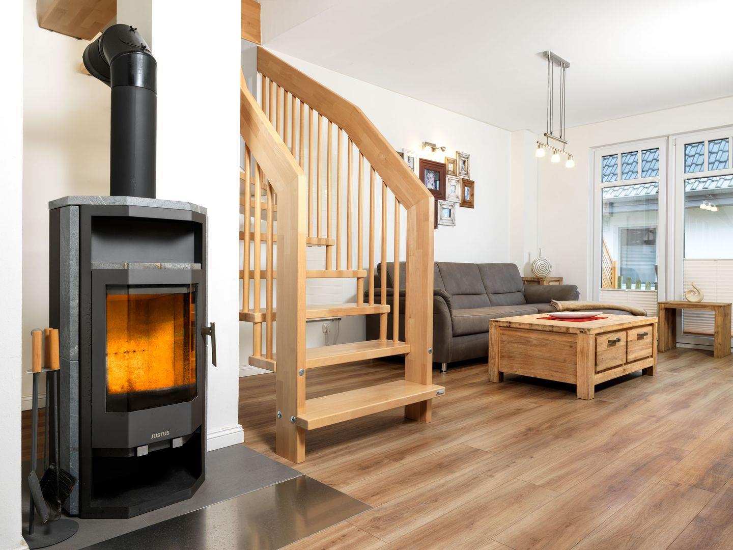 Machen Sie es sich kuschelig am Kaminofen. Außerdem stehen zur Zerstreuung ein Flat TV mit DVD-Blu-Ray-Player sowie ein Radio zur Verfügung.