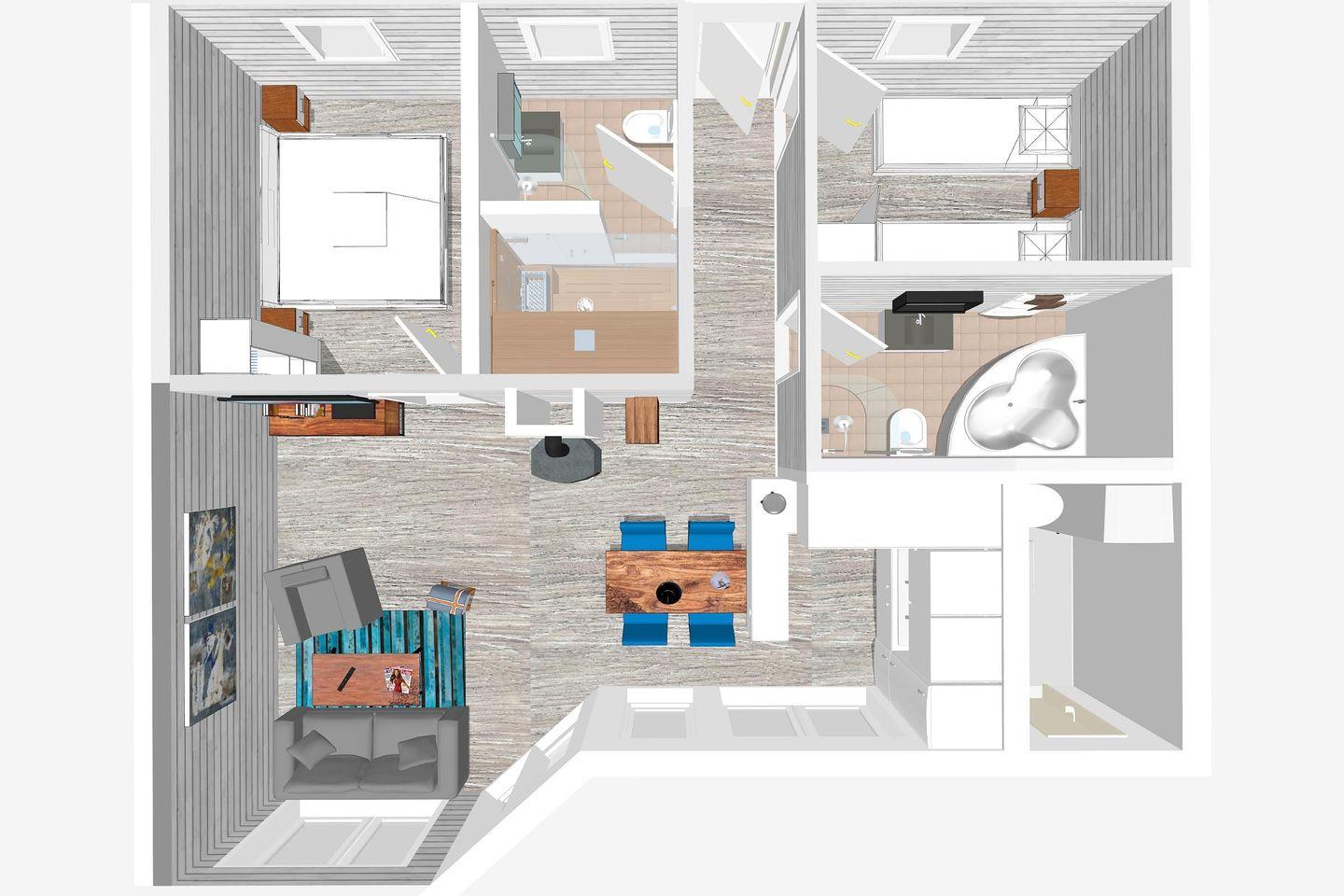 Für kalte Tage erwarten Sie 2 Wellness-Bäder: Ein Bad mit Dusche, WC und Sauna sowie ein weiteres Bad mit Badewanne, Dusche und WC.