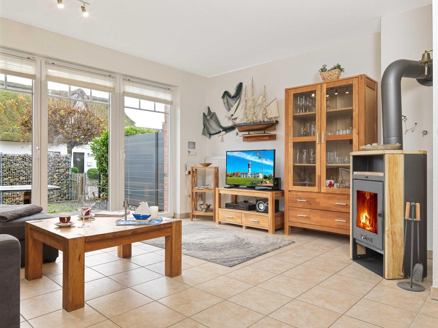 Diese Doppel-Haushälfte verfügt im Erdgeschoss über einen großzügigen, hellen Wohnraum mit separater Essecke, Kaminofen und moderner Einbauküche. Vom Wohnzimmer aus haben Sie direkten Zugang zur Terrasse mit Gartenmöbeln für gemütliche Sonnentage.