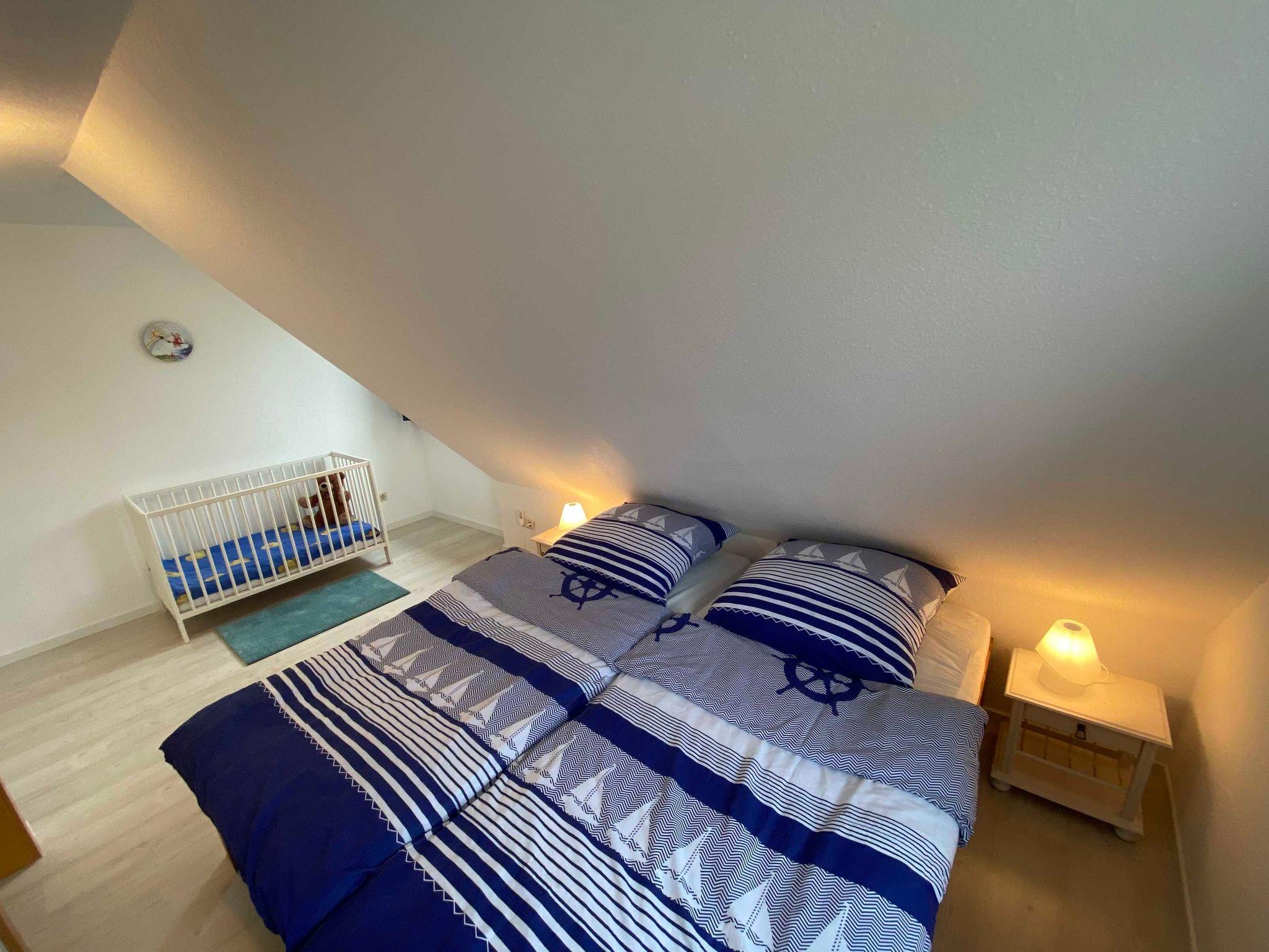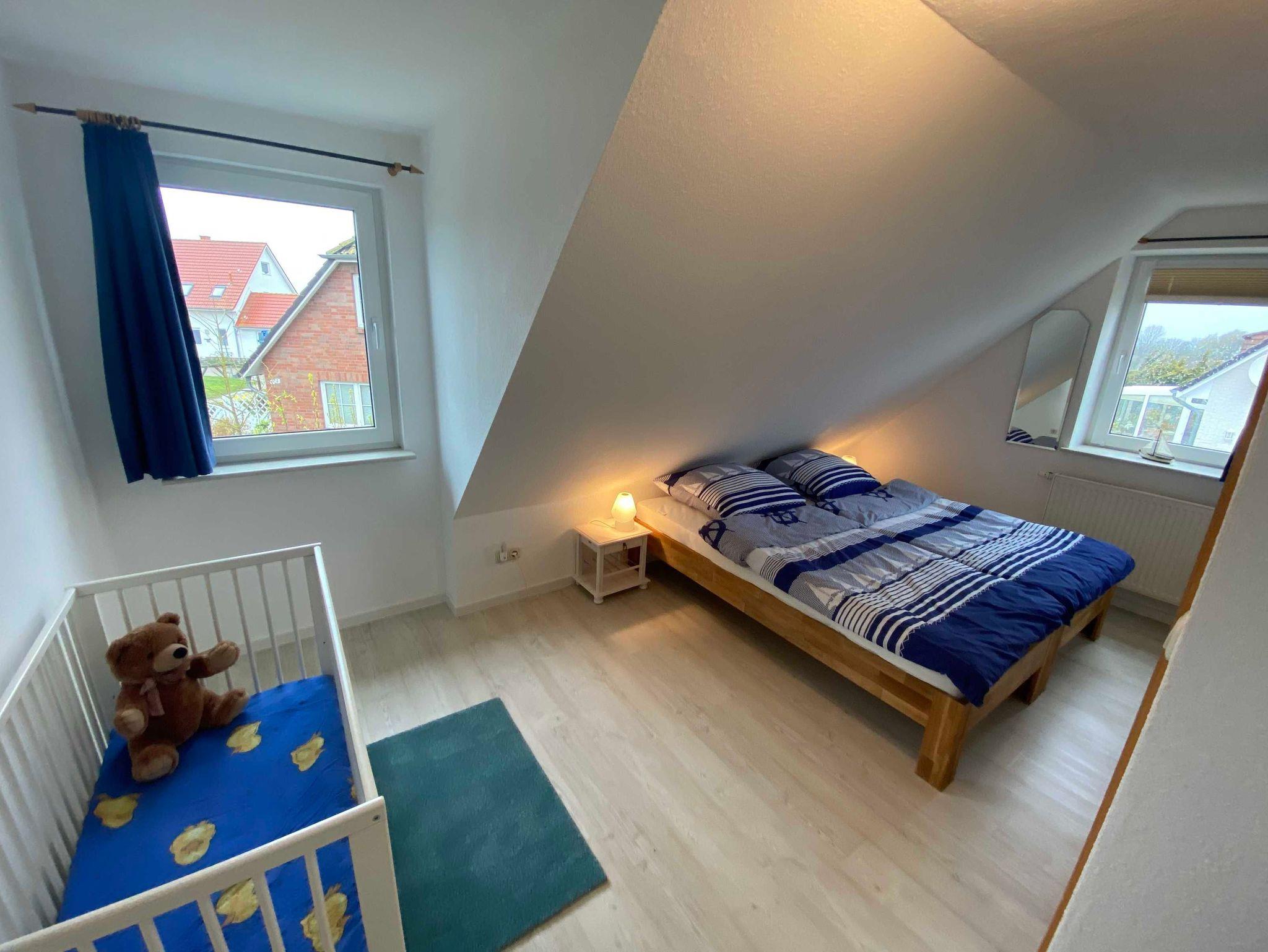 Ein Schlafzimmer ist mit Doppelbett augestattet. Das zweite Schlafzimmer verfügt über 2 Einzelbetten und ein Babygitterbett.