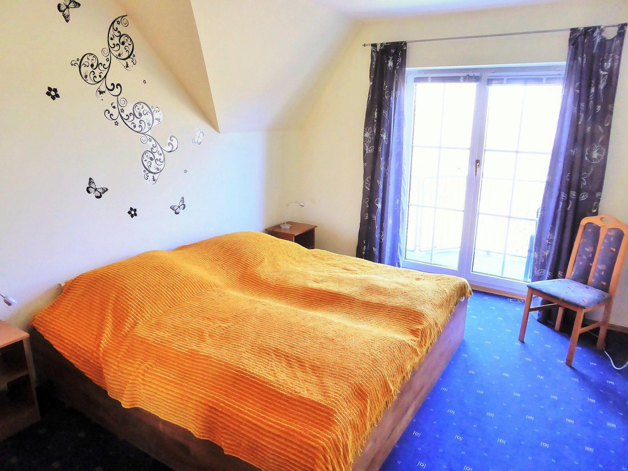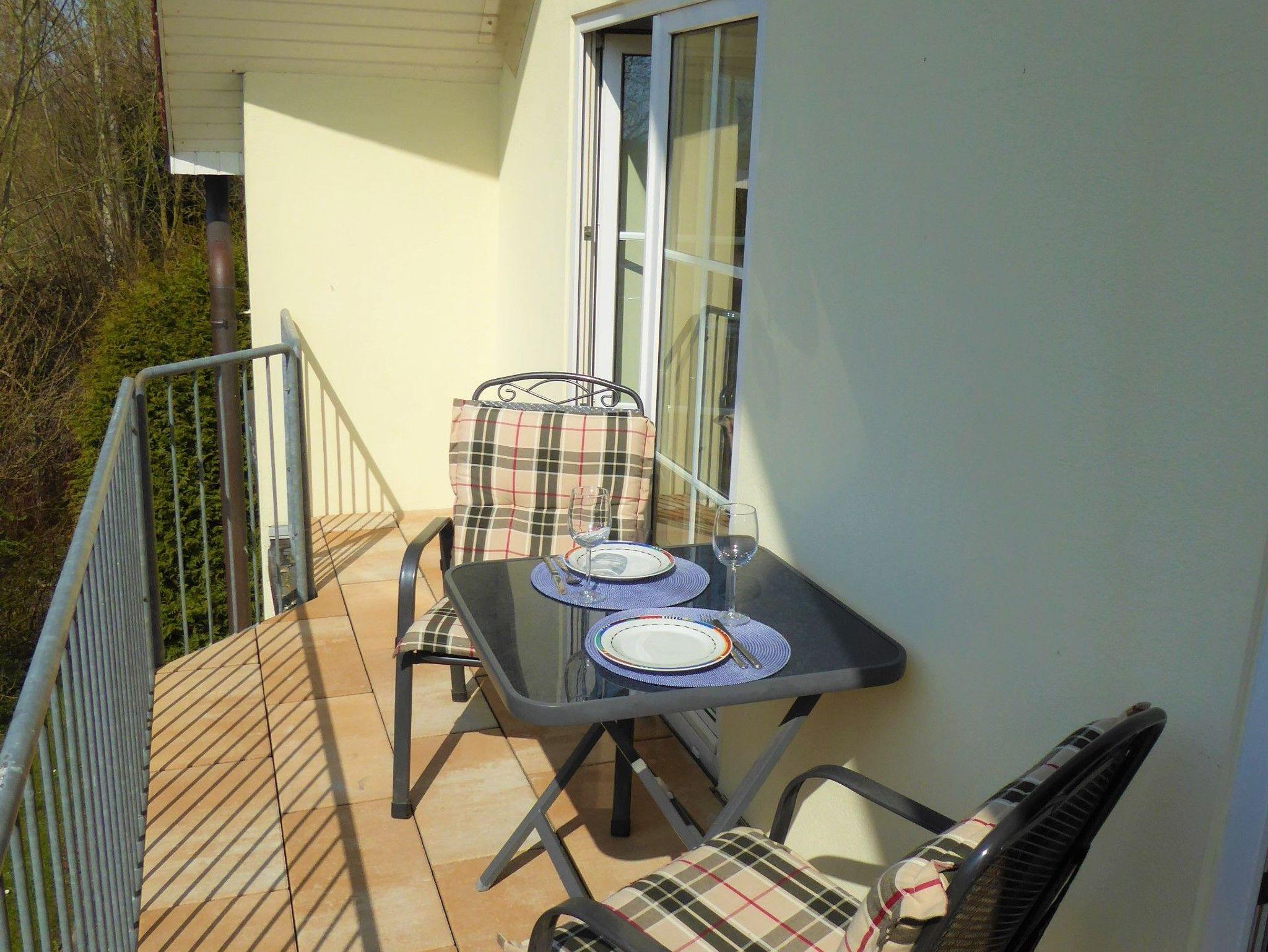 Die Ferienwohnung verfügt über ein Schlafzimmer mit Doppelbett und ein Wohnzimmer mit Schlafsofa für max. zwei Personen. Der große Balkon ist sowohl über das Wohnzimmer als auch das Schlafzimmer begehbar. Darüber hinaus gibt es eine moderne Küchenzeile mit Spülmaschine und einen Essbereich sowie ein Duschbad. WLAN, Bücher und Spiele stehen den Gästen in der Ferienwohnung zur Verfügung. Bettwäsche und Handtücher können gegen eine Gebühr dazu gebucht werden.