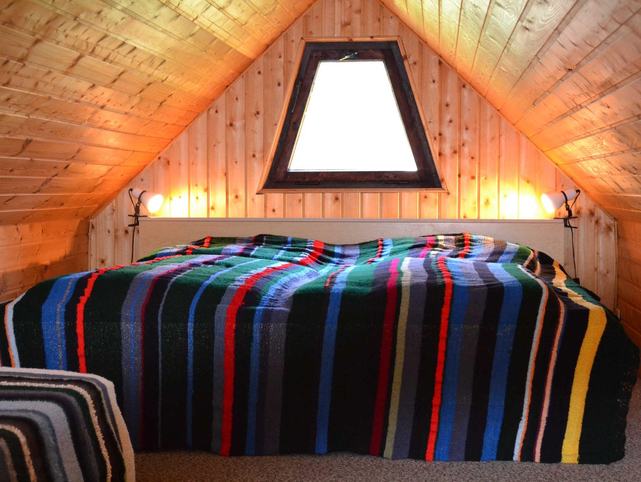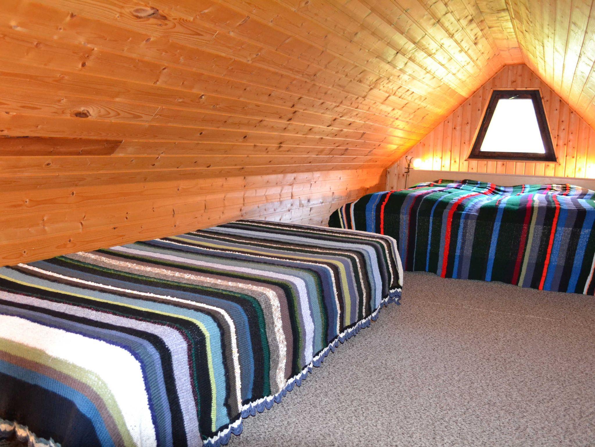 • aus dem Wohnzimmer führt eine Treppe ins Dachgeschoss mit steilen Dachschrägen, in dem sich das Schlafzimmer mit