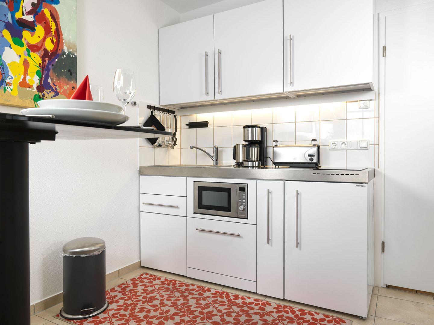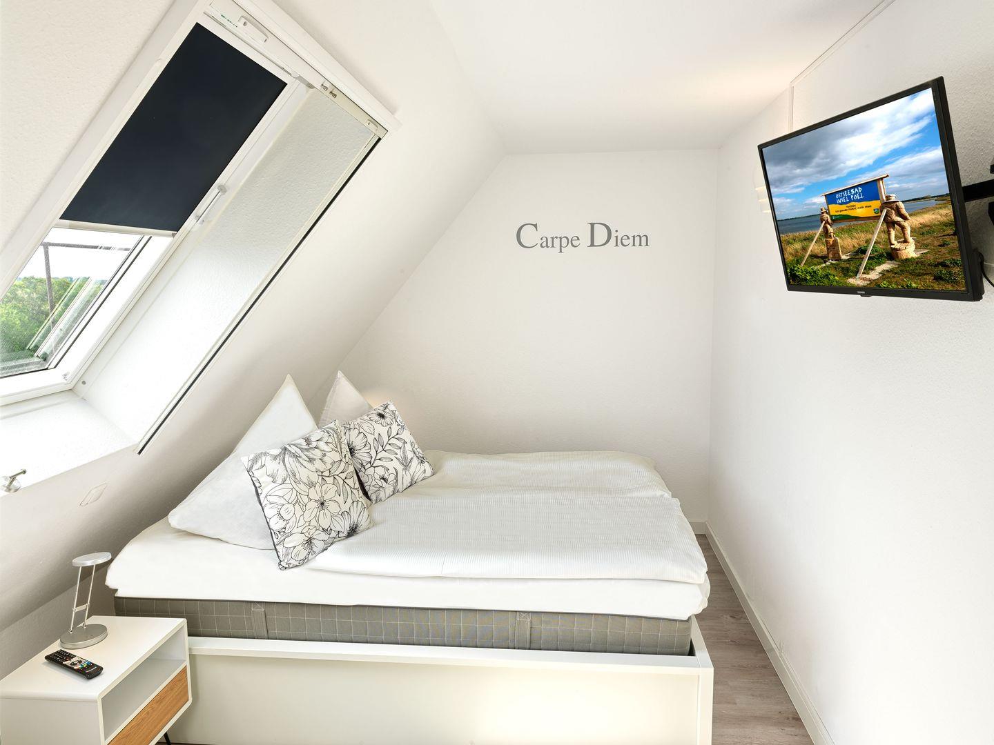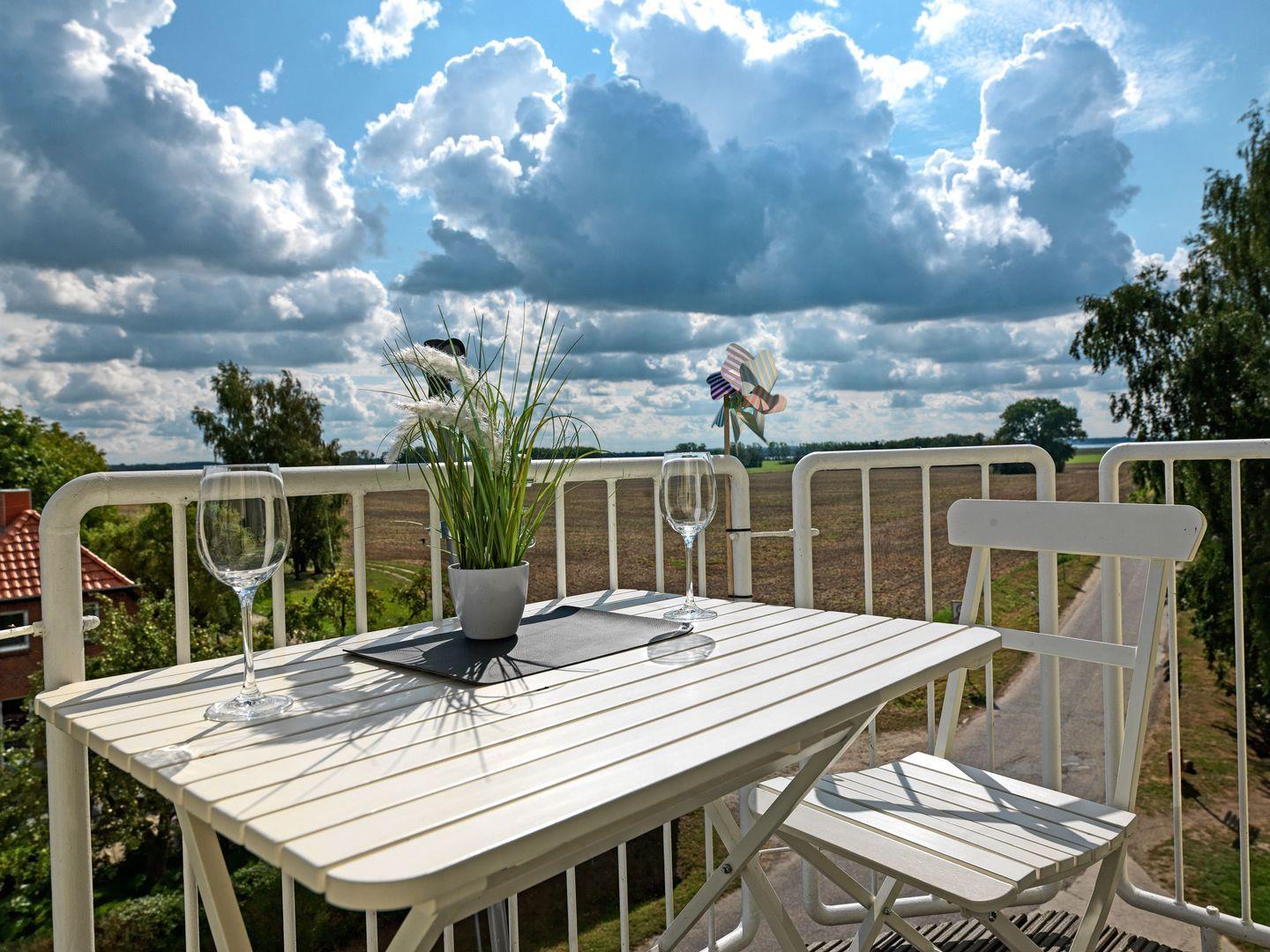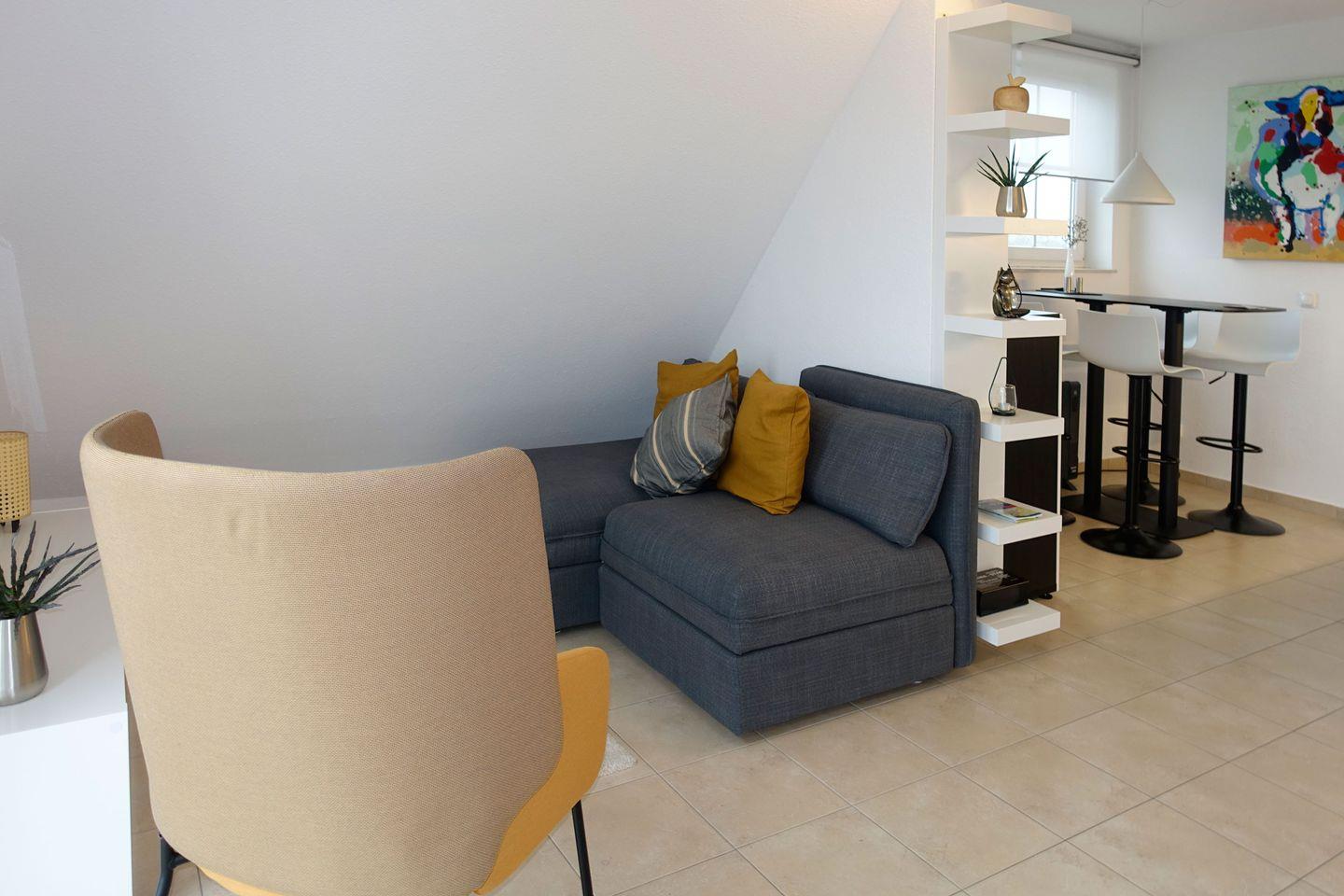 Schöne Ferienwohnung im 3. OG. Der gemütliche Wohnbereich mit Couchecke verfügt über einen TV/HiFi und Balkon mit Gartenmöbeln. Von hier schauen Sie auf die Felder von Gollwitz und in einer kleinen Entfernung können Sie auch das Meer sehen. Die offene Einbauküche ist mit Mini-Geschirrspüler, Mikrowelle, Kühlschrank, 2-Platten-Ceranfeld, Kaffeemaschine, Wasserkocher, Toaster ausgestattet. Im Küchenbereich integriert ist der Essbereich (erhöhter Tisch mit erhöhten Stühlen). Bad mit Dusche/WC. Im Dachgeschoss befindet sich das Schlafzimmer mit Doppelbett in Komforthöhe für 2 Personen mit TV (begehbar über eine schmale Raumspar-Treppe). Die gesamte Wohnung ist mit einer Fußbodenheizung ausgestattet.