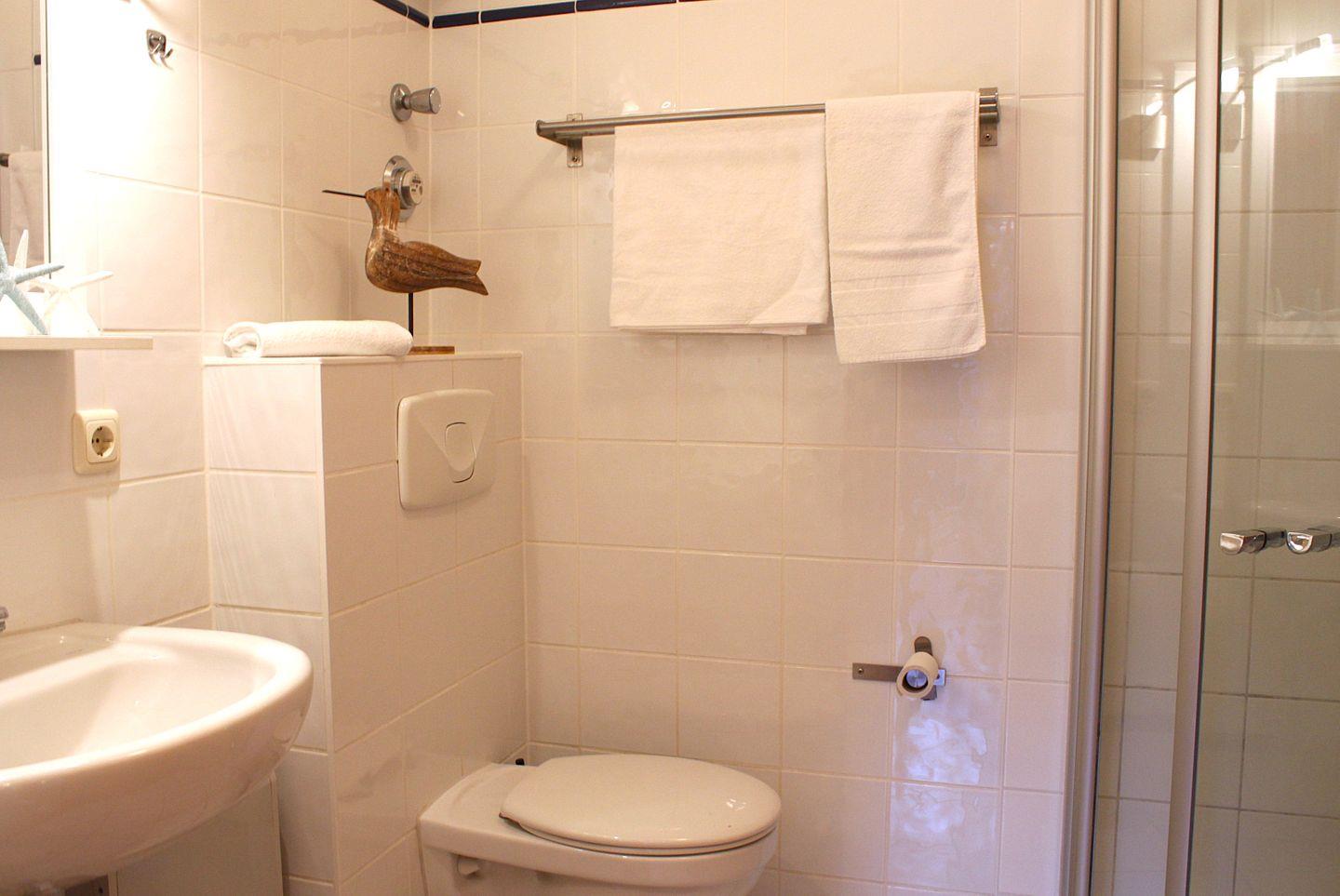 Im Badezimmer verfügen Sie über eine ebenerdige Dusche, Waschtisch und WC.