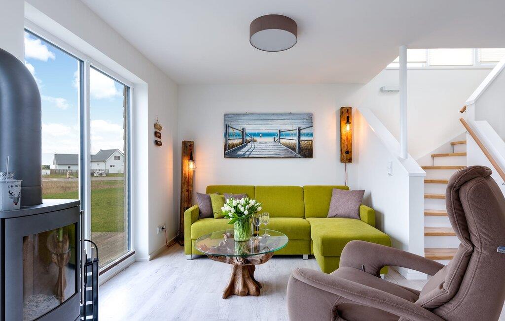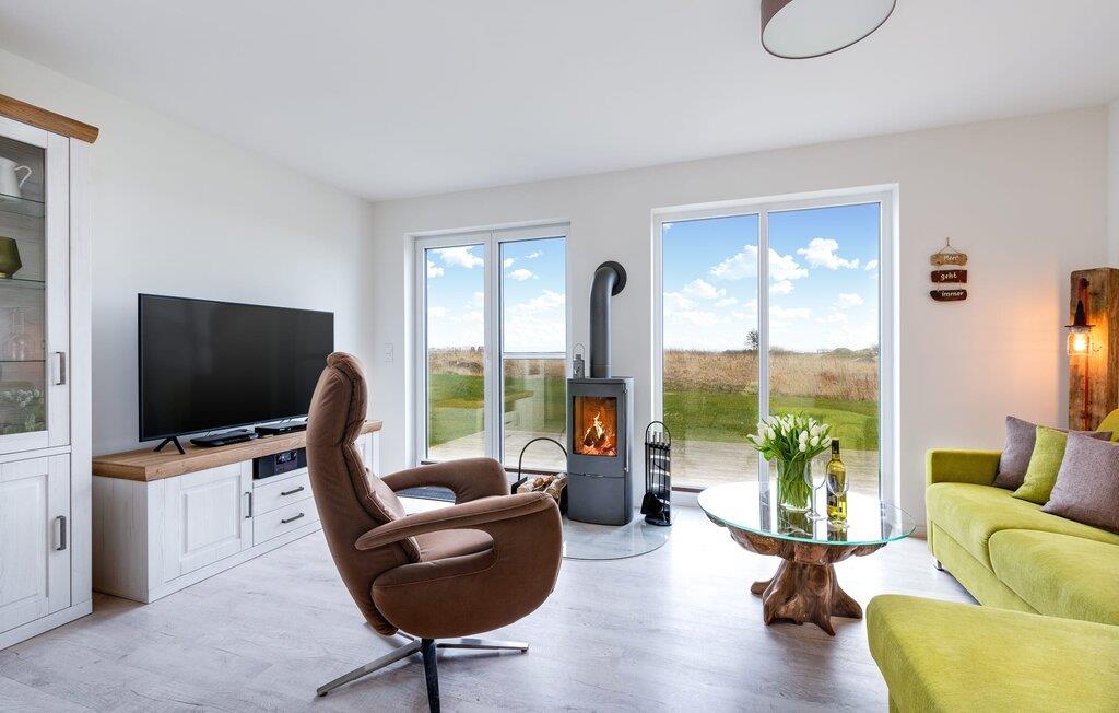 Den hyggelige opholdsstue giver direkte adgang til naturen. Udstyret med en behagelig L-formet sofa, kan I slappe af komfortabelt foran pejsen selv på dage med dårligt vejr.