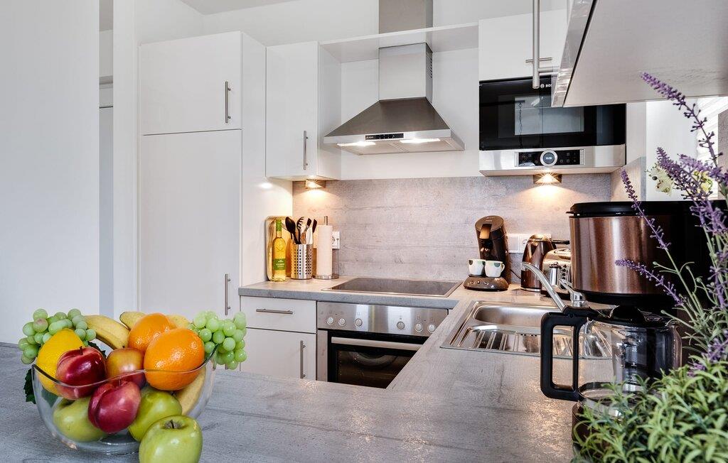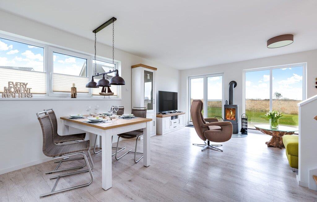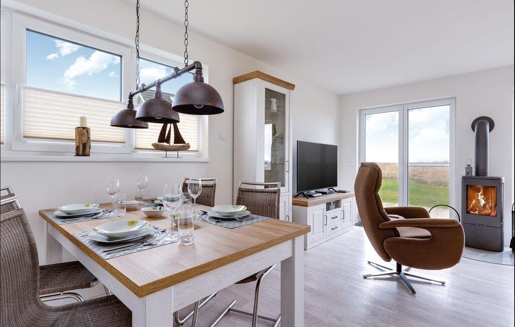 På ferien er der tid til omfattende madlavningstimer Det fuldt udstyrede køkken-alrum lader intet tilbage at ønske og inviterer jer til at tilbringe stimulerende timer gennem køkkenbordet. Terrassen i direkte tilknytning til opholdsområdet lover hyggelige grillaftener med udsigt til engen. Morgenmad i morgensolen på østterrassen, ren feriefølelse.