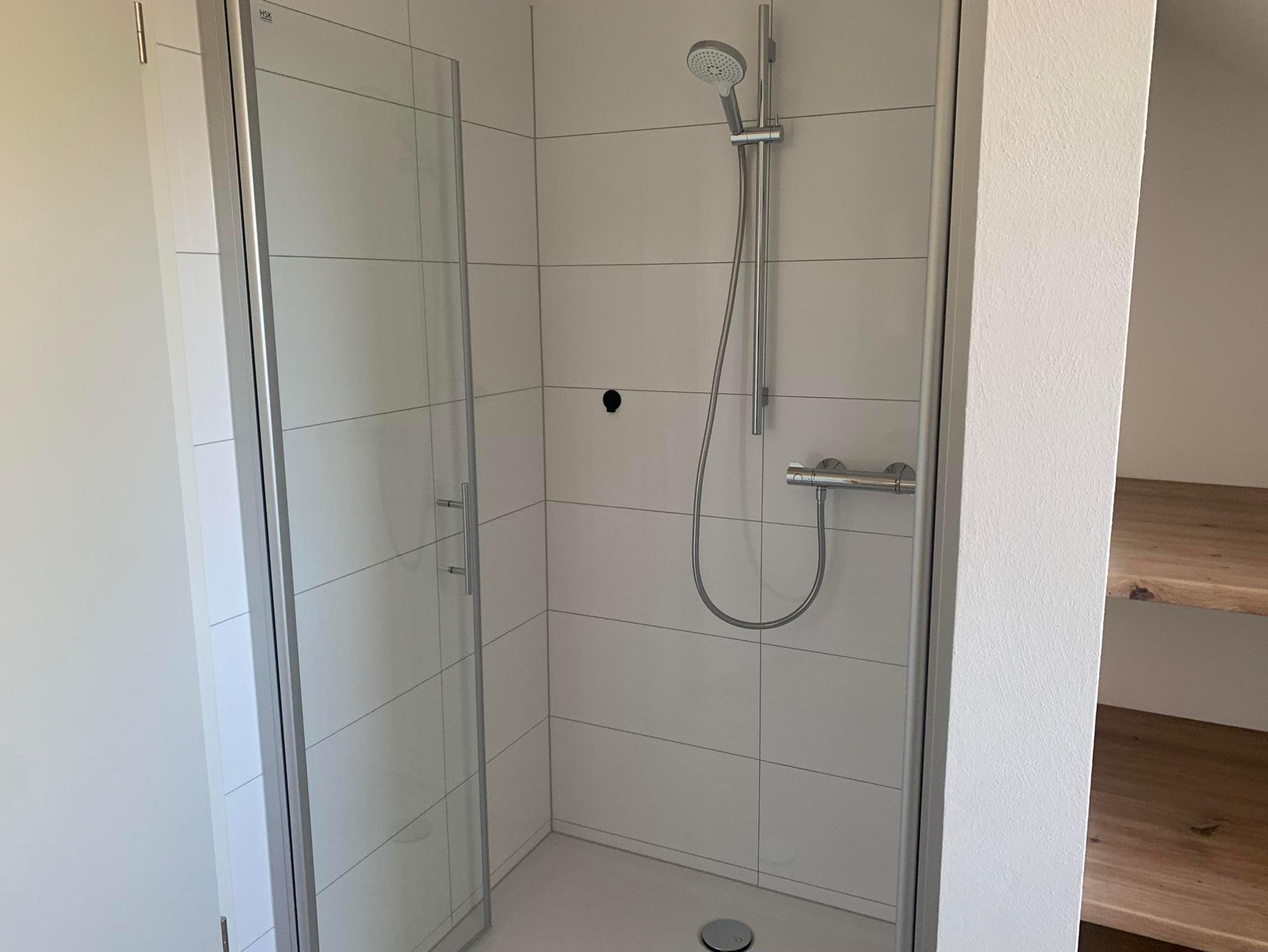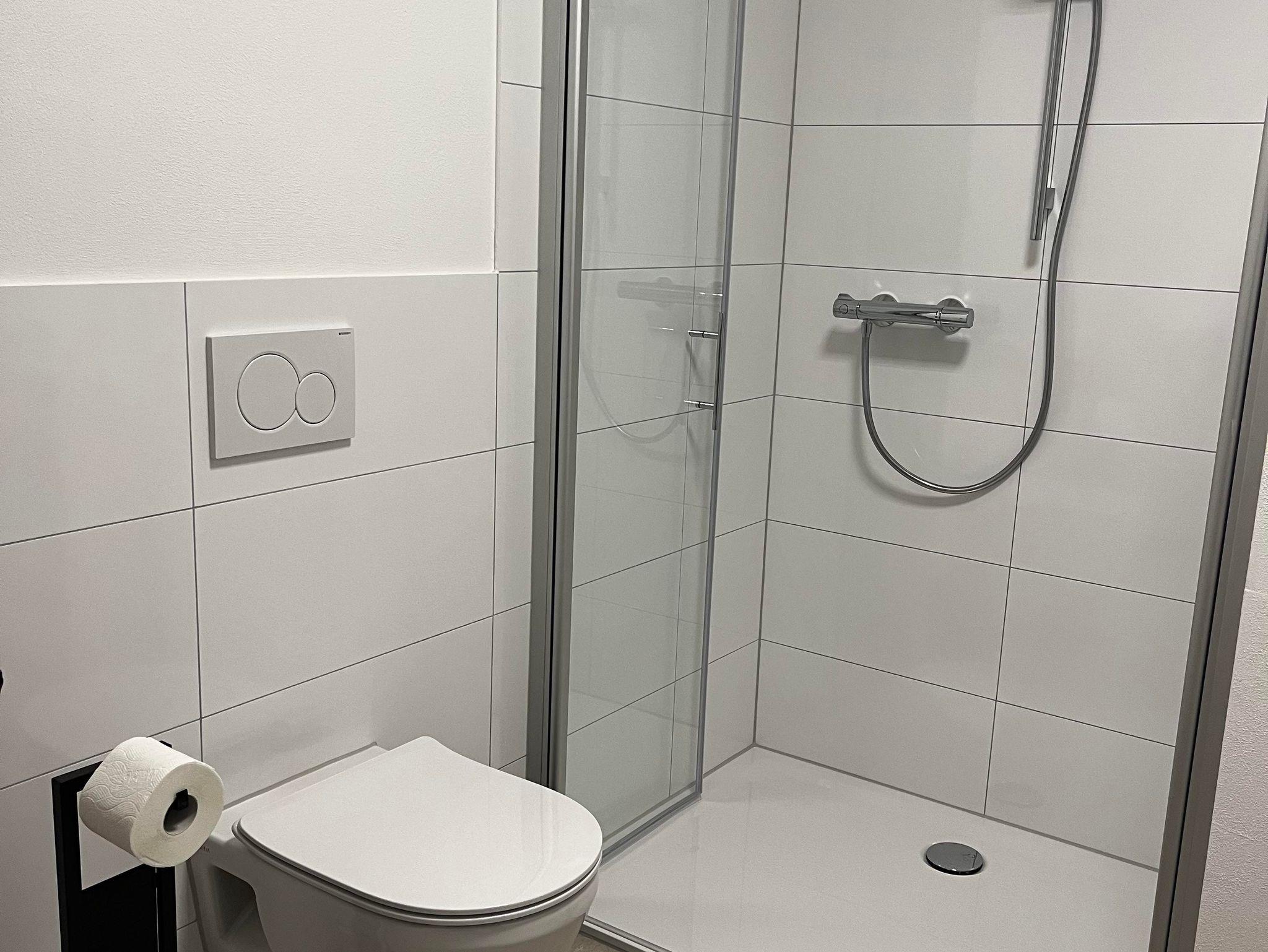 Bad: Modernes Badezimmer mit Dusche, Waschbecken und WC.
