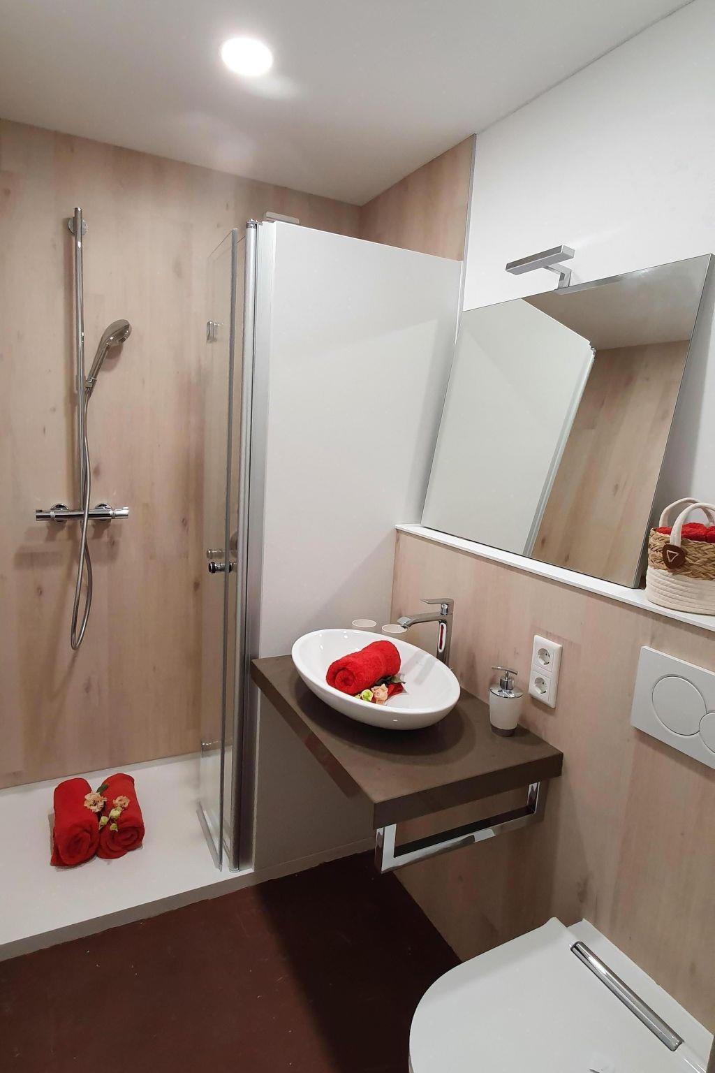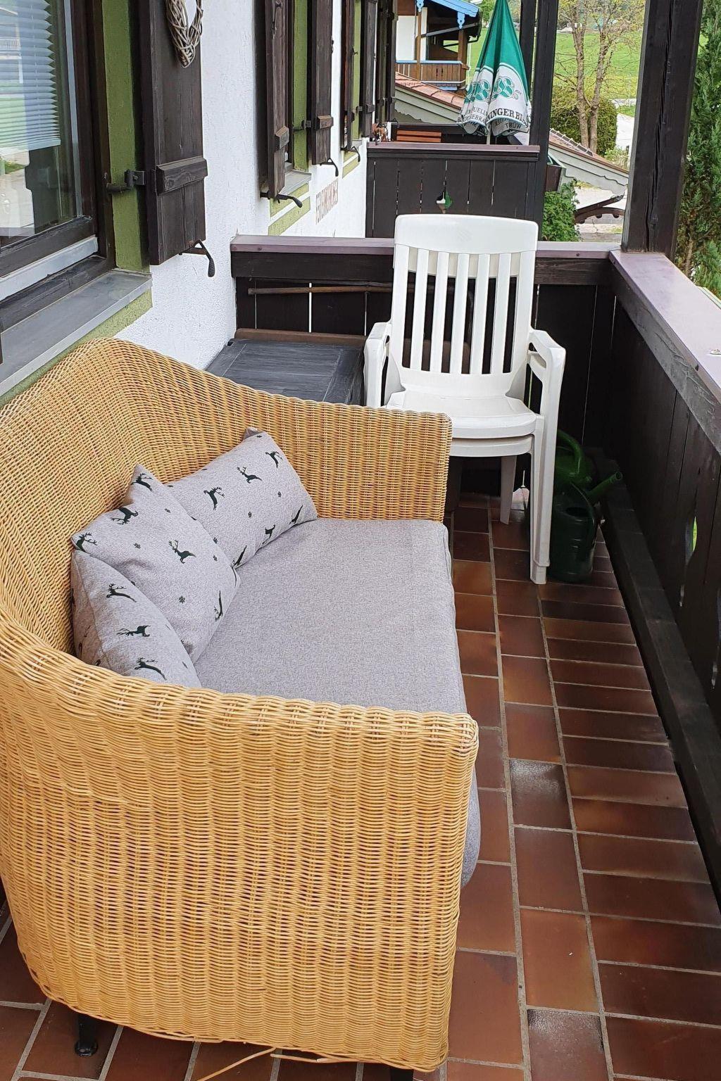 We offer disinfectant spray in our flat. Our Alpenblick holiday flat has a sun-drenched living room with dining area and kitchenette. This is well equipped with a cooker with oven, a fridge-freezer, microwave, dishwasher, bread slicer and coffee machine. In the cosy living area there is a sofa which, when pulled out, provides sleeping space for one person. The living room is also furnished with two leather armchairs, a flat-screen TV, electric fireplace, socket strip with USB connection and DAB radio. Cosy open fire. From the wrap-around balcony (south-east-south-west) you will find a table, chairs and deckchairs and lounge furniture for sunny balcony holidays. Here you can enjoy a marvellous panoramic view of our Bavarian mountains. The bedroom with large window front and balcony door has a double bed 1.80m x 2.00m with comfort mattresses and offers a wardrobe with mirror and a highboard for your personal belongings. Bed linen is provided. Also a flat screen TV. The bright, friendly bathroom with shower/WC, clothes horse, hairdryer and towels as well as the small hallway with wardrobe, mirror, shoe rack and cupboard complete the holiday flat. A reserved parking space is available free of charge, as well as Wi-Fi and the Chiemgau Card.