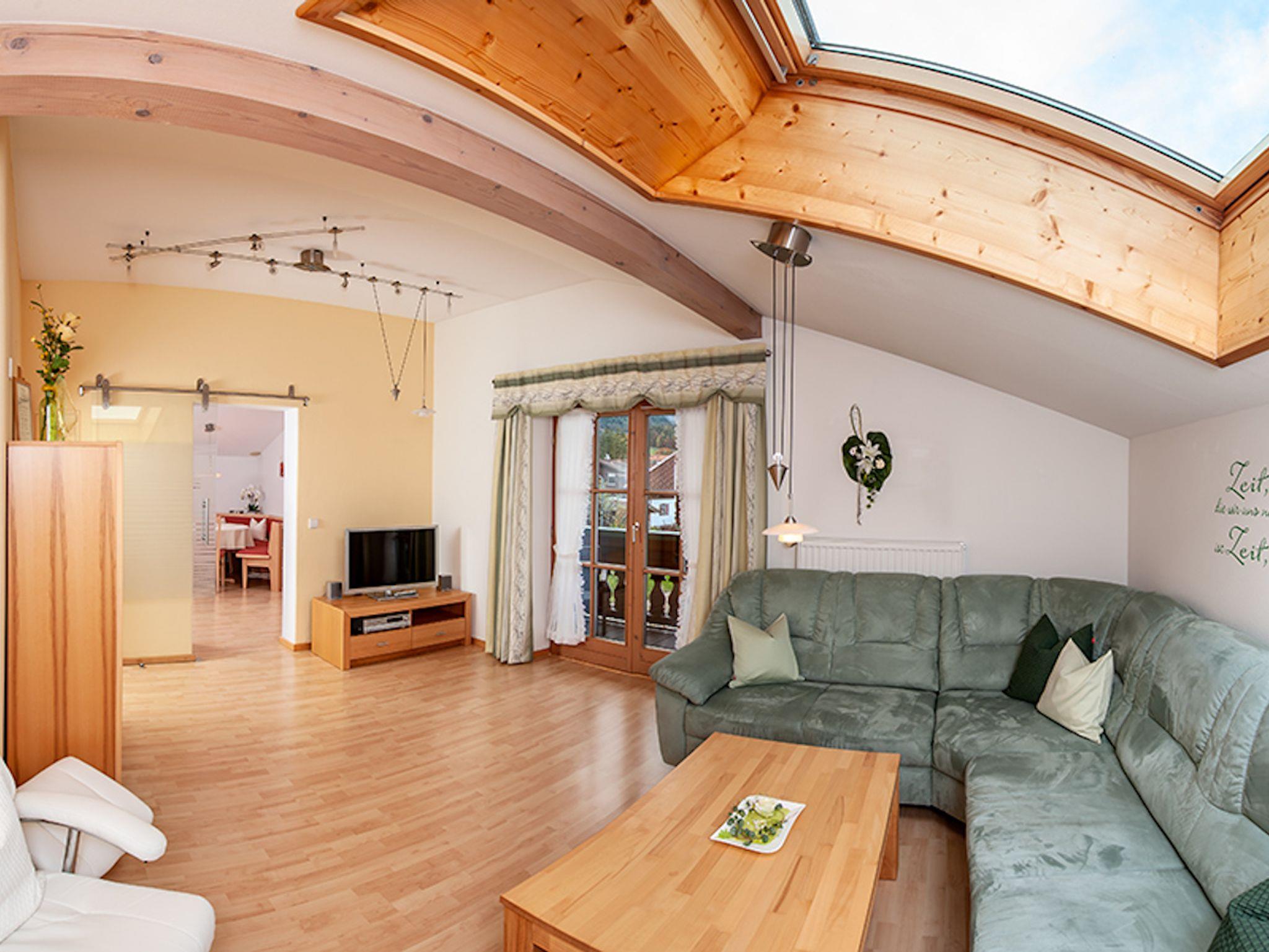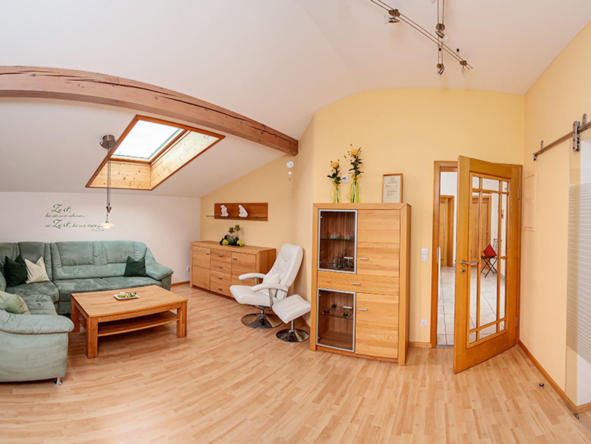 Schöne sonnige und großzügig ausgestattete Ferienwohnung für 2 bis 4 Personen, über das gesamte erste Obergeschoss mit Balkon, in ruhiger Lage mit Bergblick nähe Ortskern. Wander-, Radwege und Langlaufloipe in unmittelbarer Nähe.