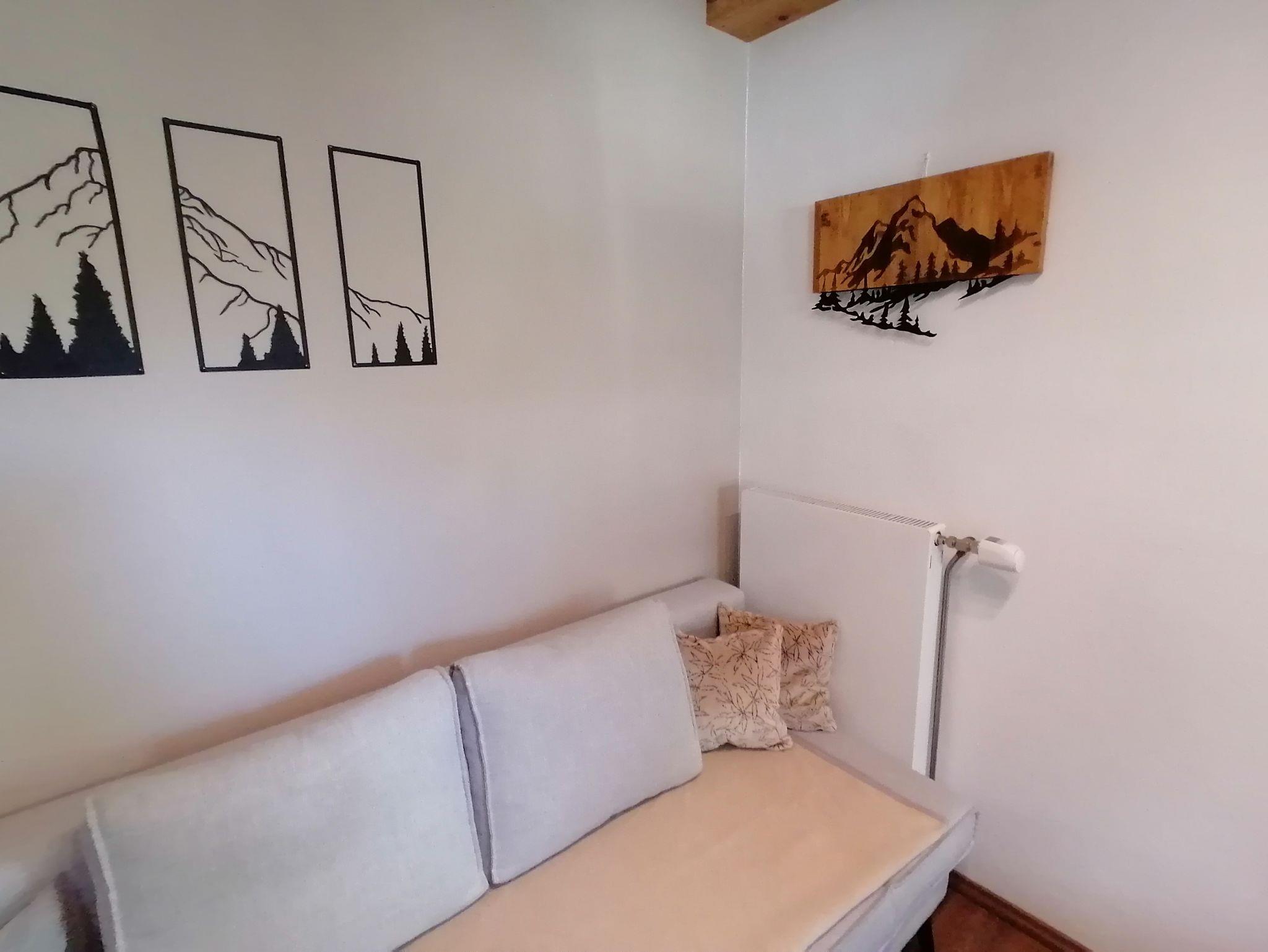 Wohnraum: Smart TV, Schlafcouch für 2 Personen, Essbereich mit Eckbank und Stühlen.
