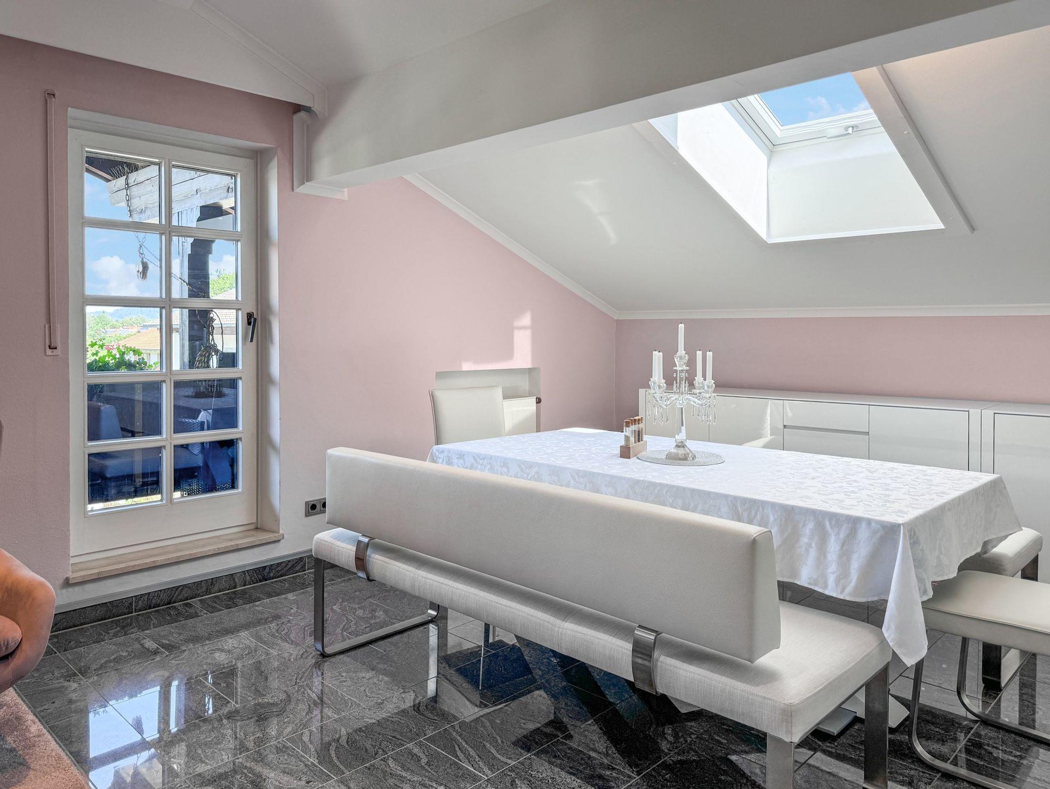 Im Wohnloft befindet sich ein gemütlicher Esstisch.
