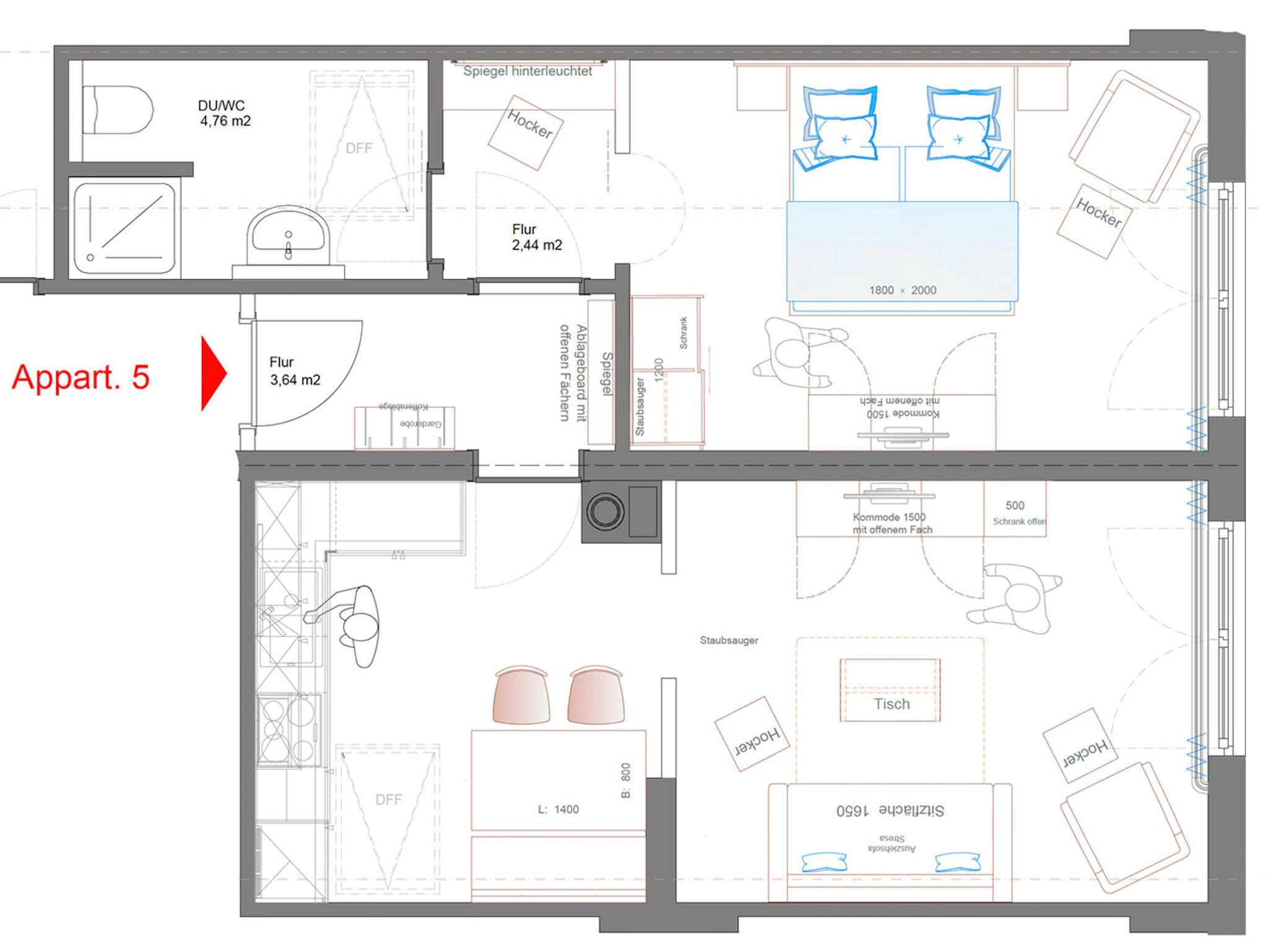 2 Zimmer – DU/WC – + separater Flur/EingangsbereichCa. 50m²2 Personen (+1)1 großer OstbalkonWohnzimmer/TV/Schlafcouch (150x195) mit Essbereich und Küche komplett ausgestattet (Herd, Backofen, Spülmaschine, Kühlschrank, Kaffee-u. Espressomaschine, Milchaufschäumer, Wasserkocher) – zum großen OstbalkonSchlafzimmer/TV, Boxspringbetten 2x 90x200, + separate Nische mit Schminktisch/Schreibtisch und beleuchtetem Spiegel – zum großen Ostbalkon