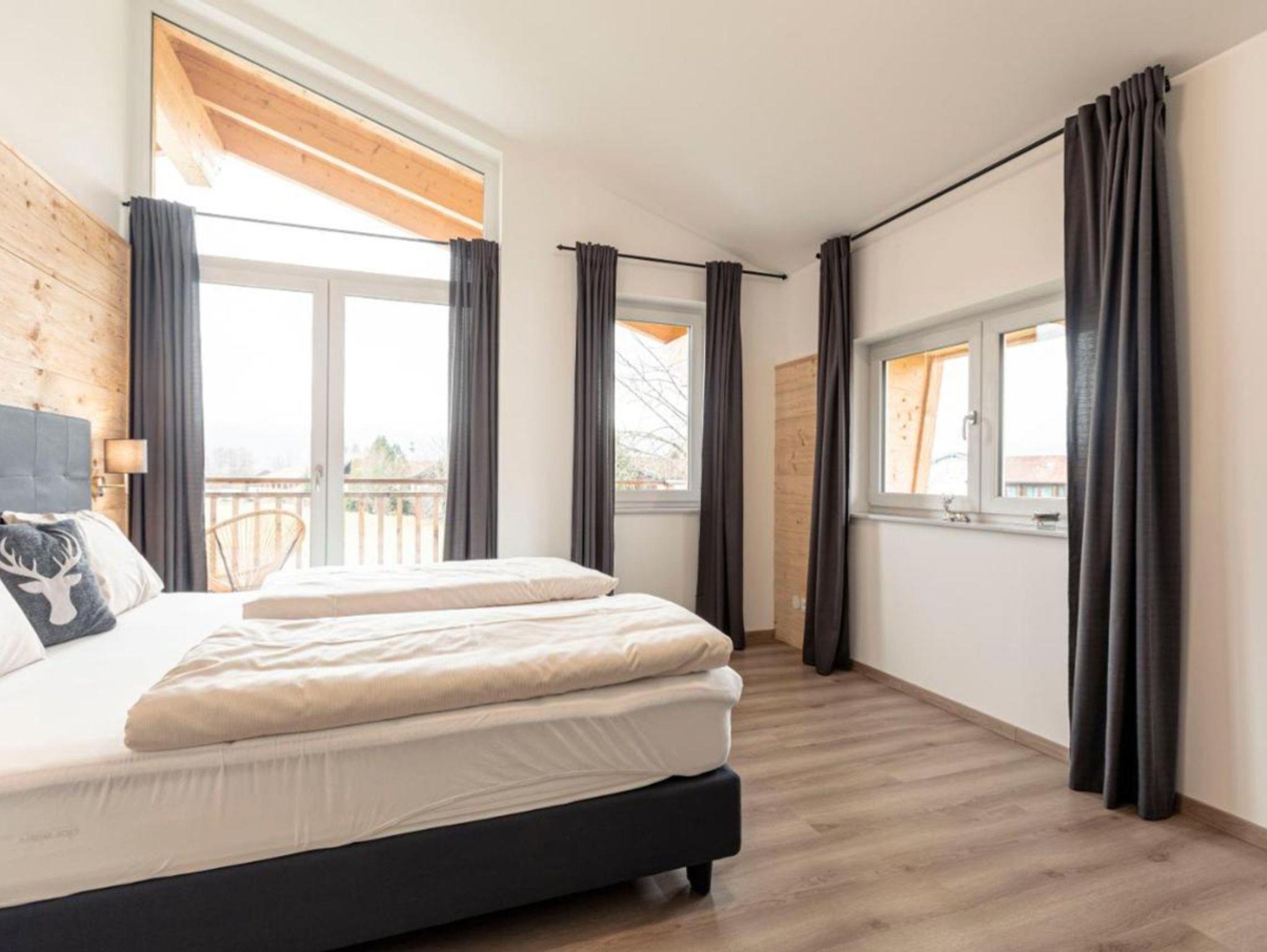 Die Schlafzimmer sind großzügig geschnitten und mit je einem komfortablen Doppelbett ausgestattet. Warme Holzmöbel, ein geräumiger Kleiderschrank und große Fenster sorgen für eine gemütliche, helle Atmosphäre. Vom Zimmer aus genießen Sie einen schönen Blick auf die umliegenden Berge oder den Gartenbereich. Verdunkelungsvorhänge sorgen für erholsamen Schlaf.