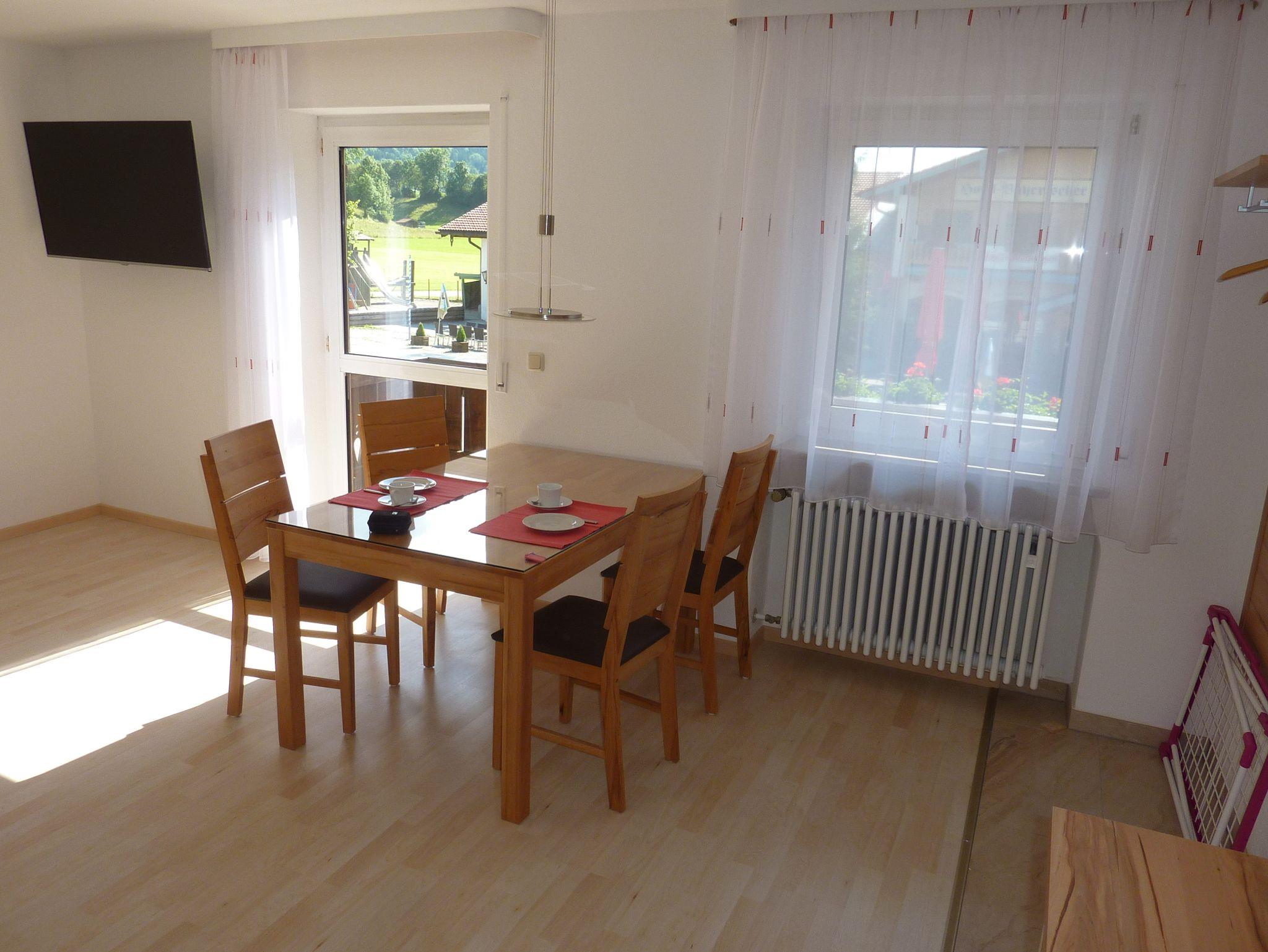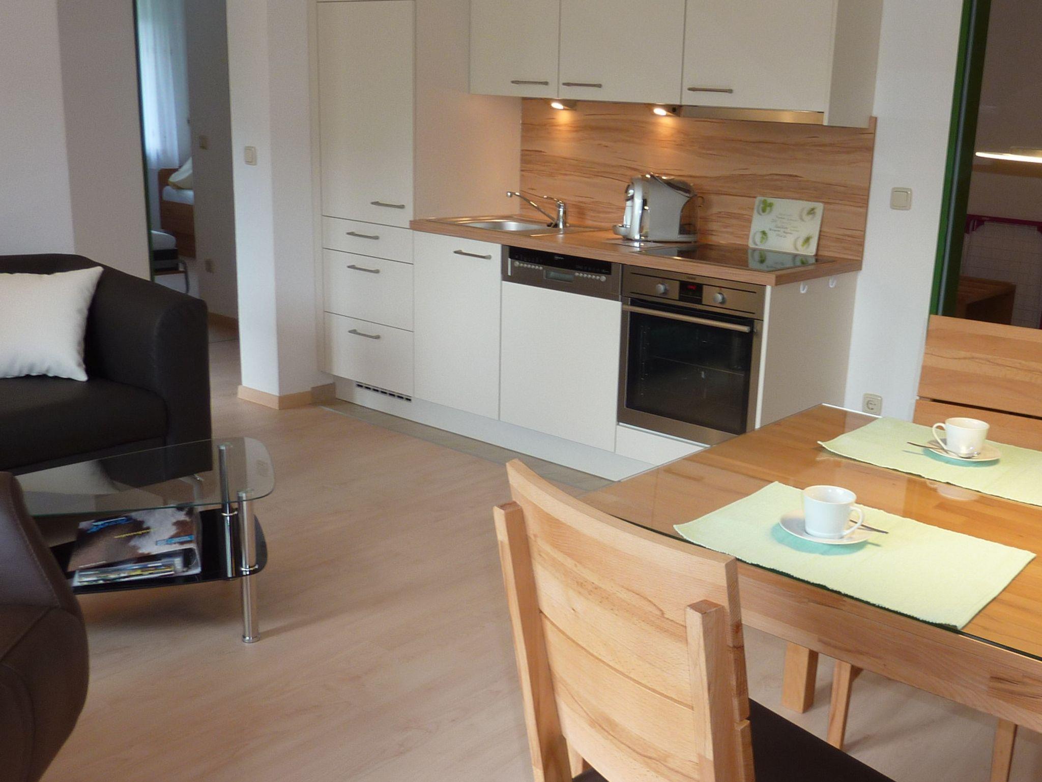 Hell eingerichtete 2-Zimmer-Wohnung auf 42 qm mit Ost-Balkon im 1. Stock. Wir bieten Ihnen Komfort mit 1 separaten Schlafzimmer, Doppelbett mit Überlänge (180 cm x 210 cm), 1 Duschbad, einer Relaxcouch und einem 50“-TV mit Sky, W-LAN. Küchenzeile mit Spülmaschine, großes Induktionskochfeld und Backofen. Billard, Tischtennis, Autorenn-Simulation, Darts, Tischkicker und Gesellschaftsspiele kostenlos im Haus. Im Sommer Fahrradraum, im Winter Skispind mit Schuhheizung.