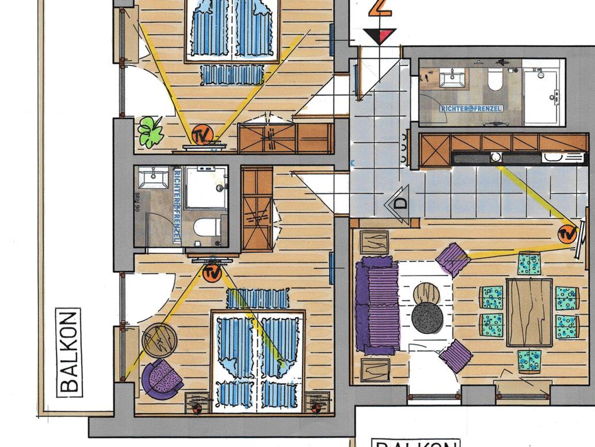Gasthof-Appartements Vroni - Chiemgau Karte, Appartement 2 für 6 Personen, 2 separate Schlafzimmer, Balkon, 65 m²