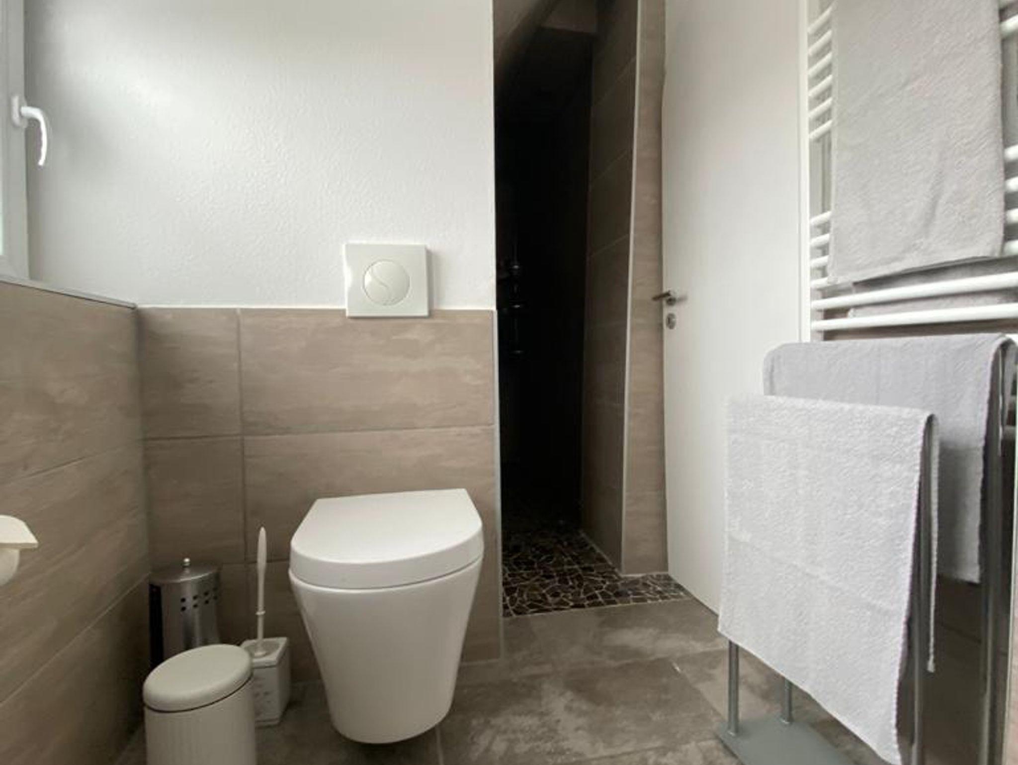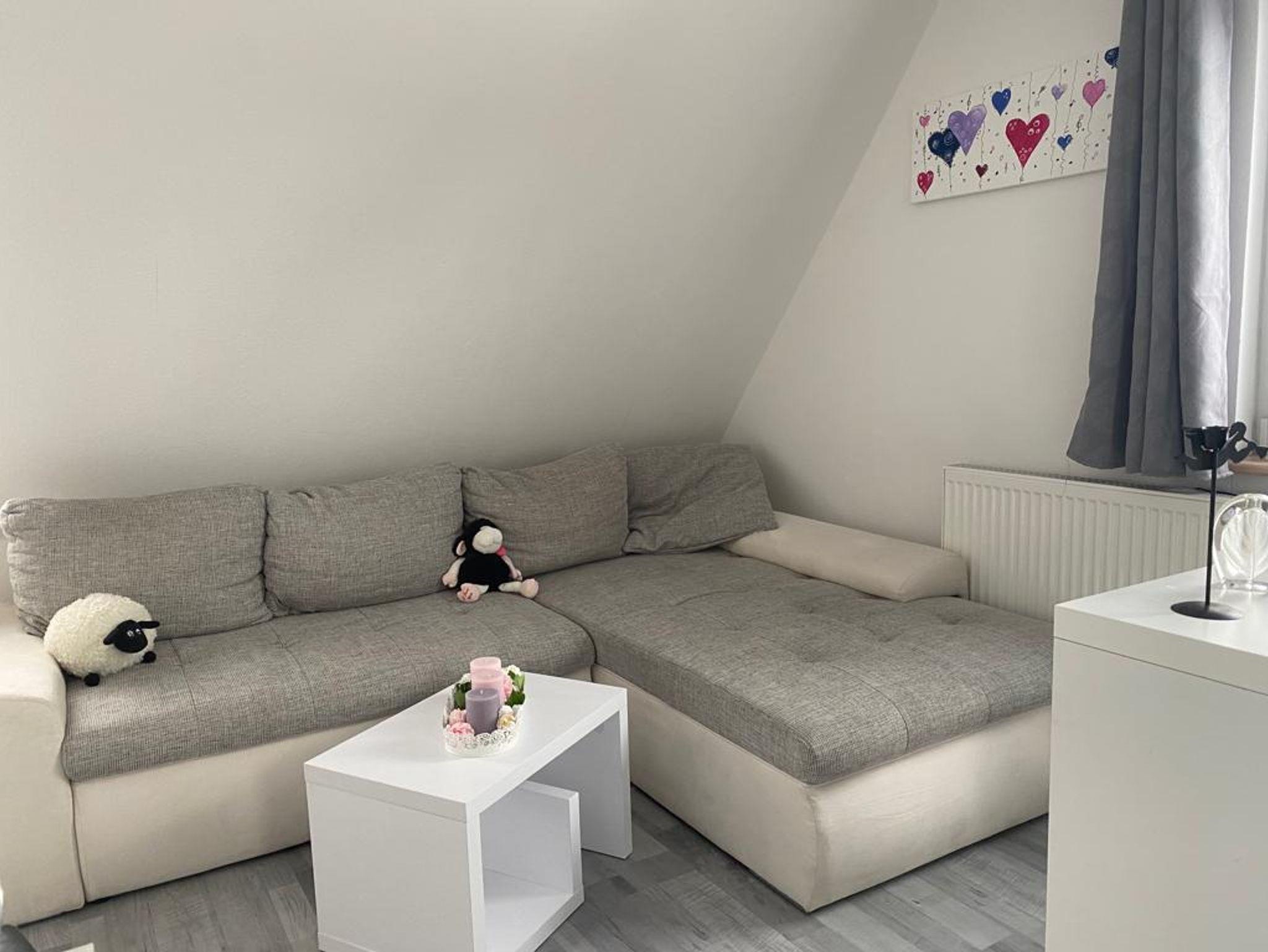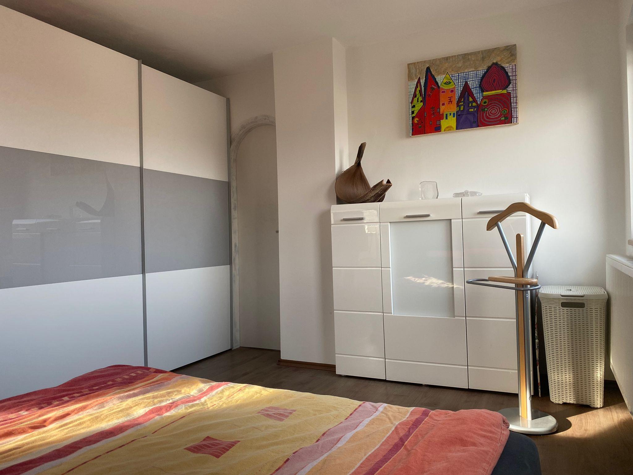 Diese helle Ferienwohnung im Obergeschoss des Hauses besteht aus einem Schlafzimmer mit einem Futonbett (160x200 cm) sowie einem Schiebeschrank, Sideboard und einem Fernseher. Das Badezimmer mit begehbare Regendusche lädt zum Entspannen ein. Der sonnendurchflutete Wohn- / Essbereich mit bequemer, ausziehbarer Schlafcouch sorgt für eine heimelige Atmosphäre. Die dem Wohnbereich angrenzende voll ausgestattete Küche verfügt über einen Herd, Ofen, Kühlschrank und ein Spülbecken, sowie Kaffeemaschine, Toaster und Dunstabzug. Der kleine an den Wohnbereich angrenzende Balkon lädt am Abend zu gemütlichem Verweilen ein. Genießen Sie bei einem lauschigen Sonnenuntergang den guten Wein.