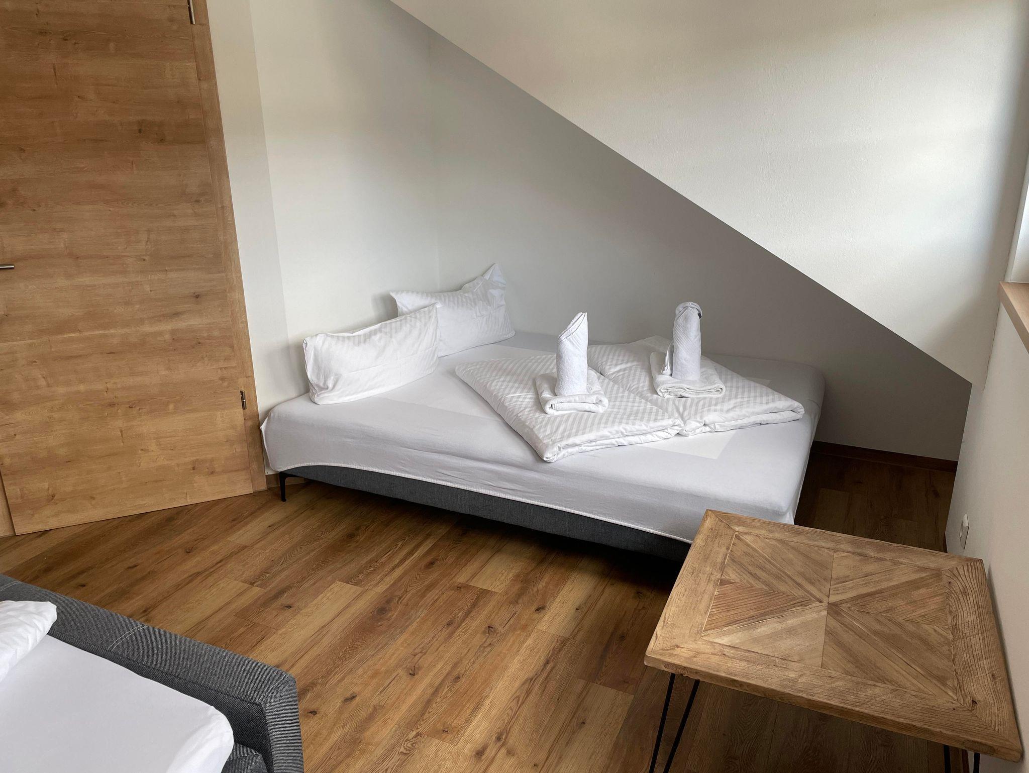 Modern und neu. Unser Superior Zimmer mit Boxspringbett, Schlafcouch, TV, Bad/WC mit begehbarer Dusche, Tisch, freies W-LAN
