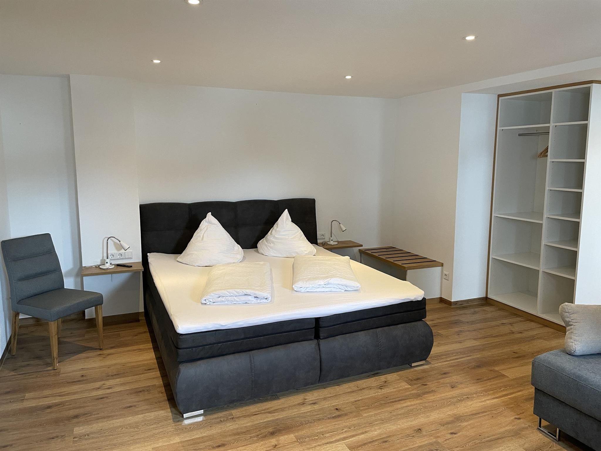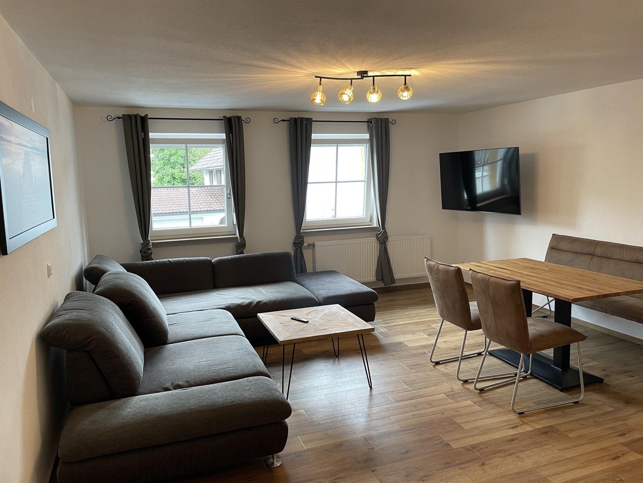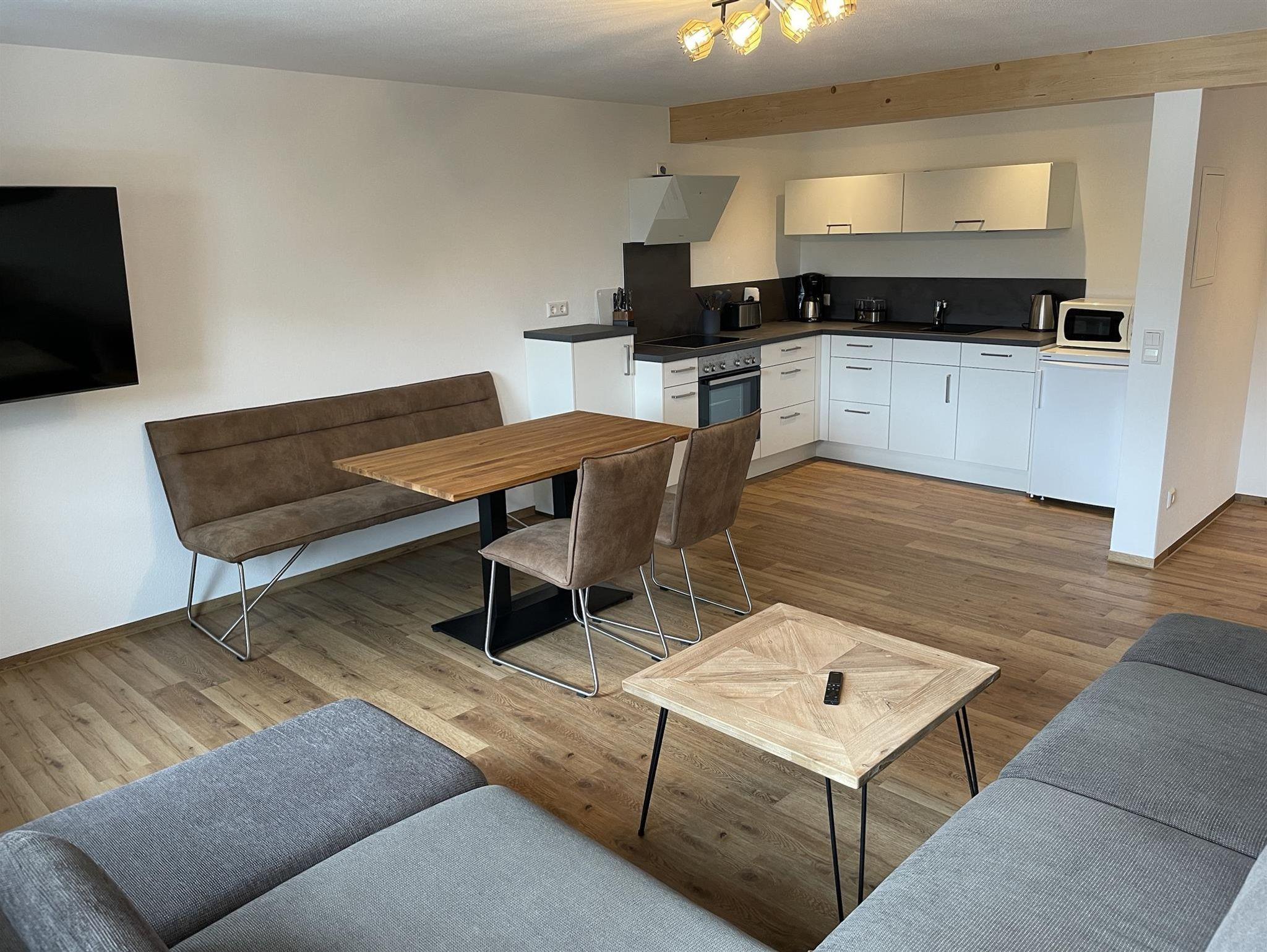 Unsere neue moderne Ferienwohnung 2 befindet sich im Haupthaus und vergfügt über 1 Schlafzimmer, einer Küche, einem Bad/WC mit begehbarer Dusche, einem schönen Balkon und einem separaten Wohn-/Essbereich mit Schlafcouch.