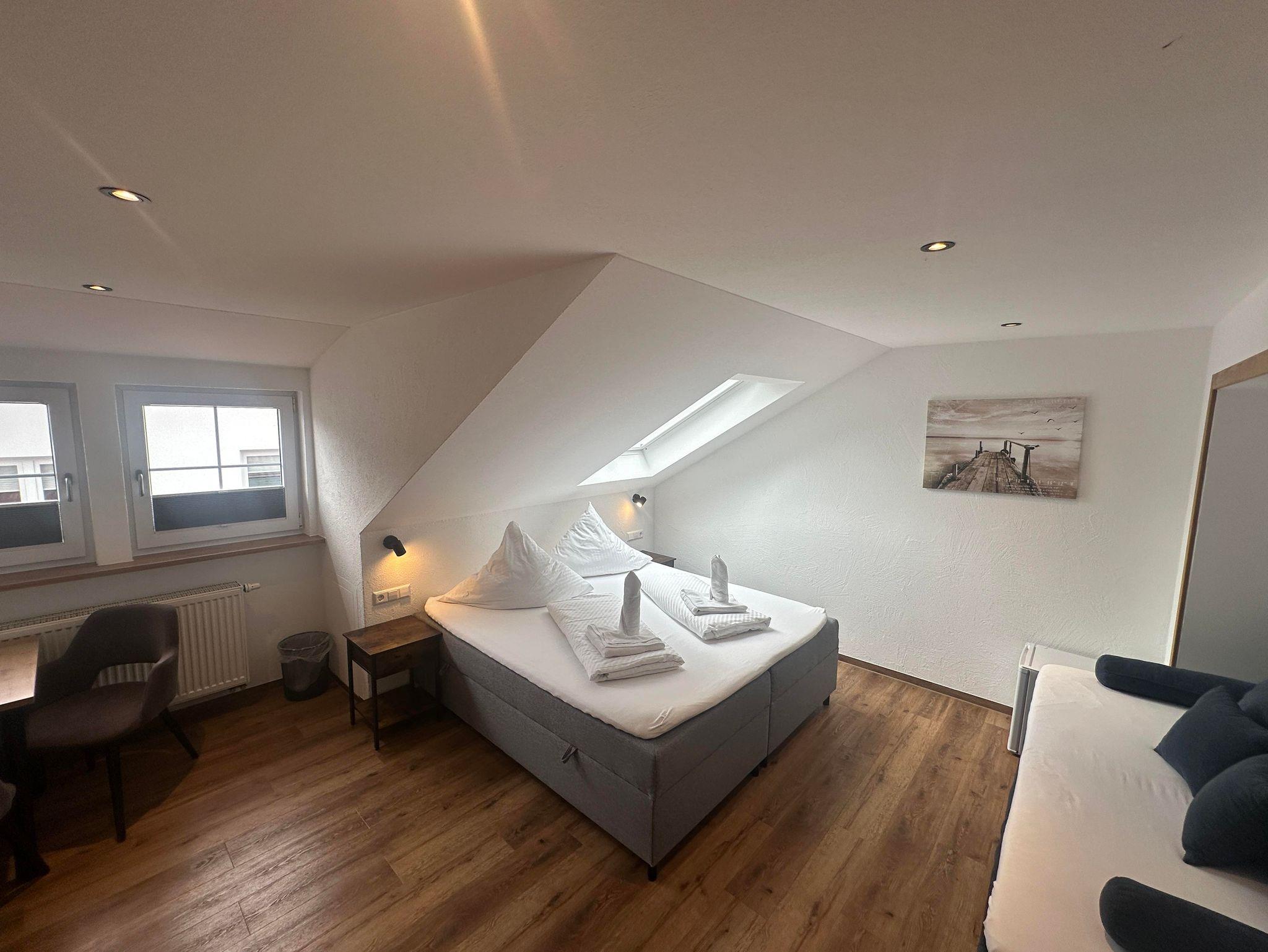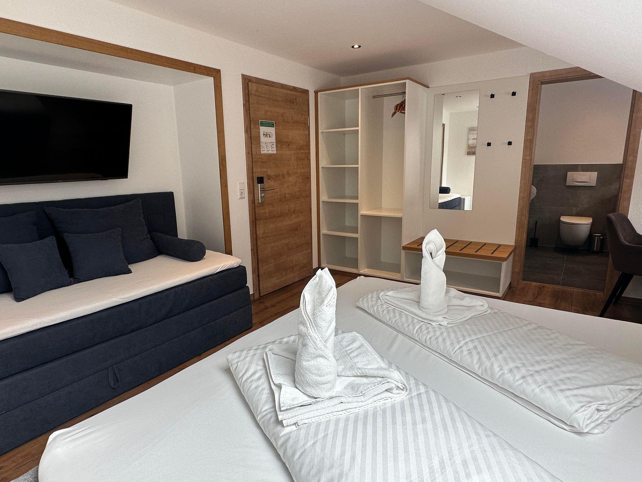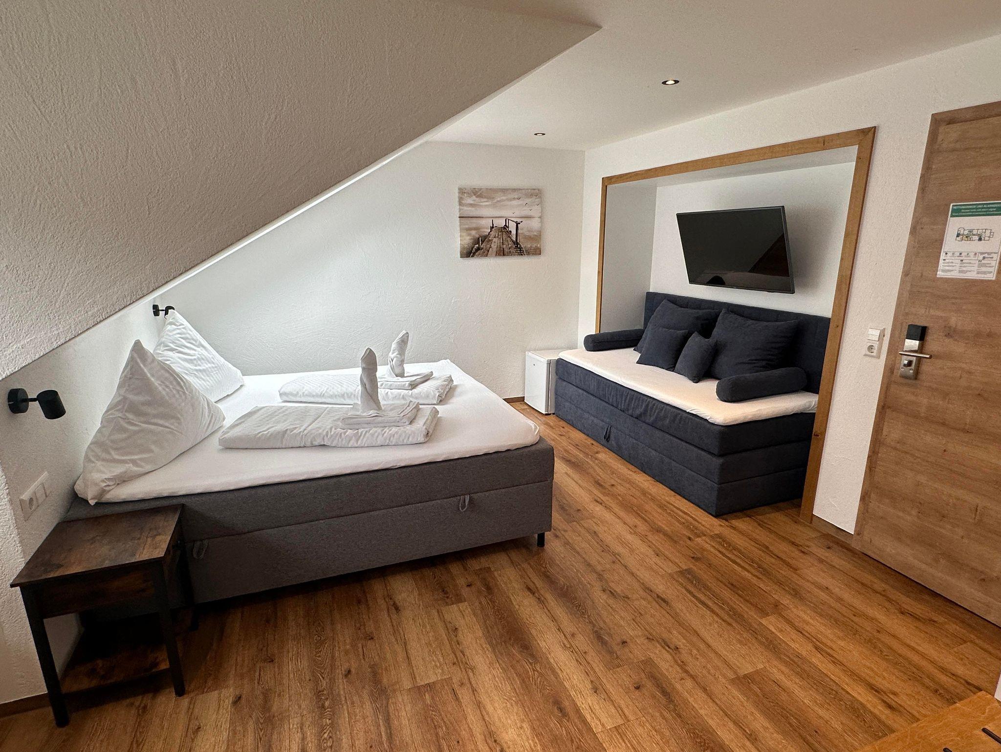 Ruhiges Doppelzimmer mit Boxspringbett, TV, Bad/WC mit begehbarer Dusche, Tisch, freies W-LAN