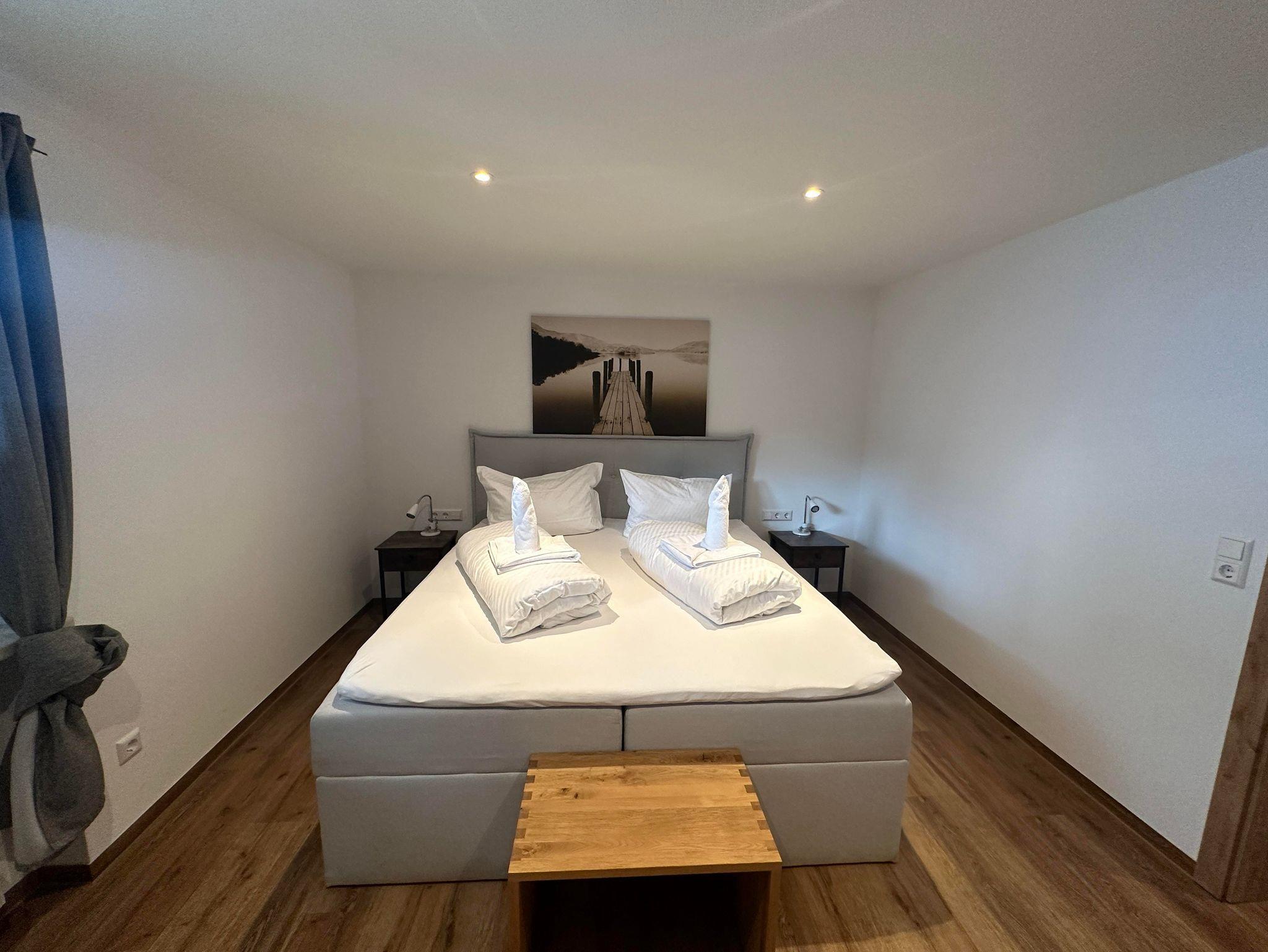 Ruhiges Doppelzimmer mit Boxspringbett, TV, Bad/WC mit begehbarer Dusche, Tisch, freies W-LAN