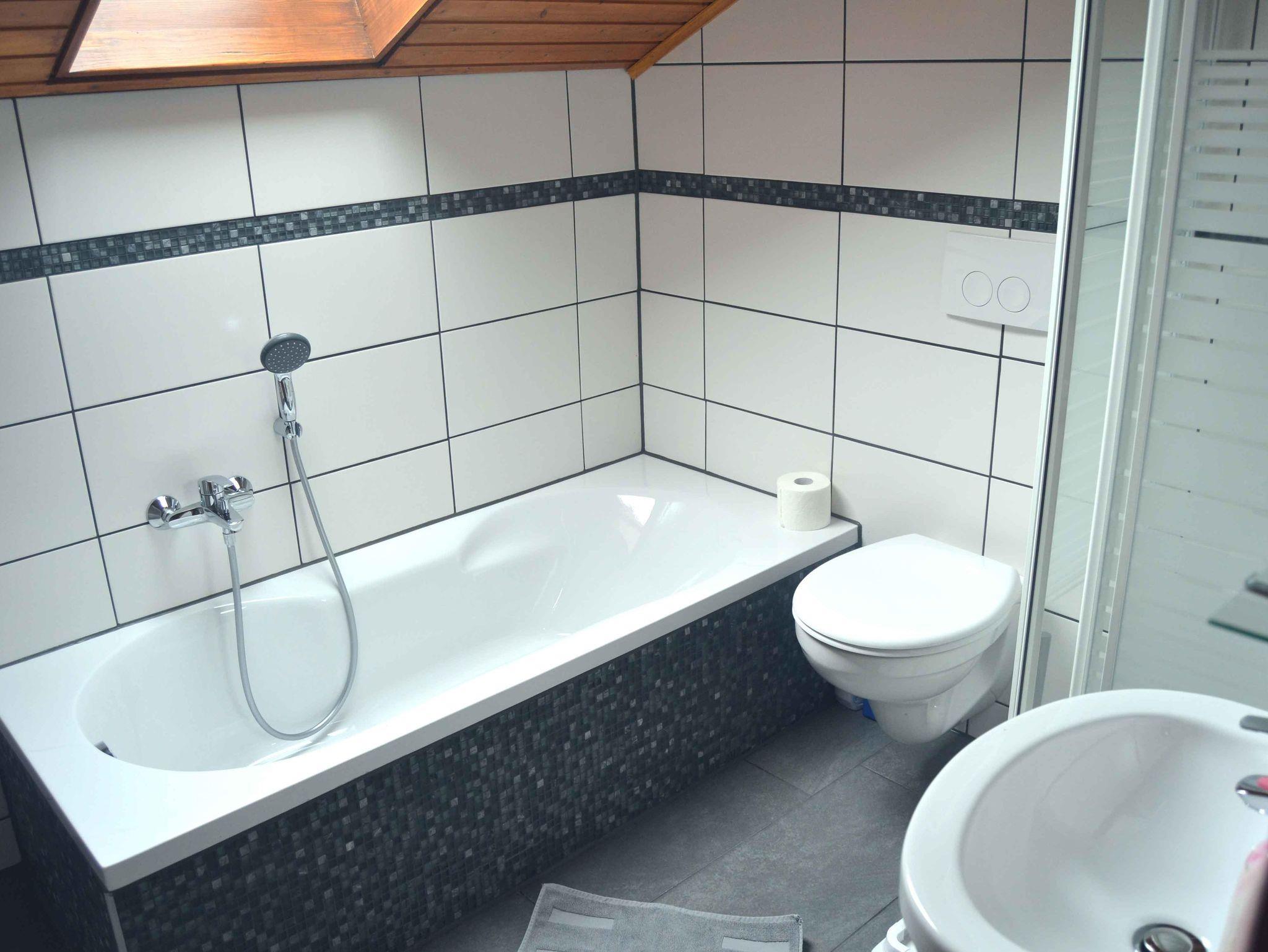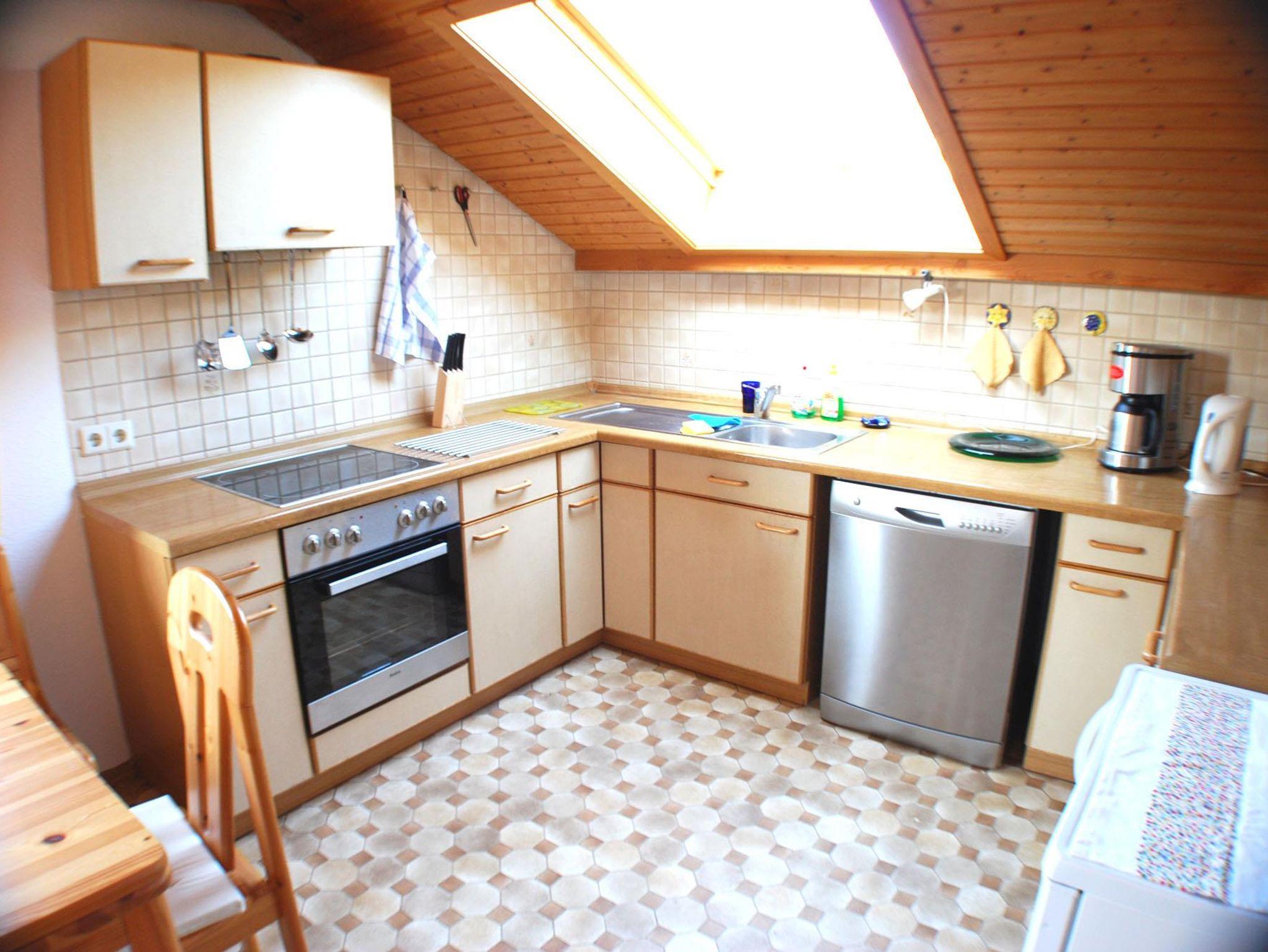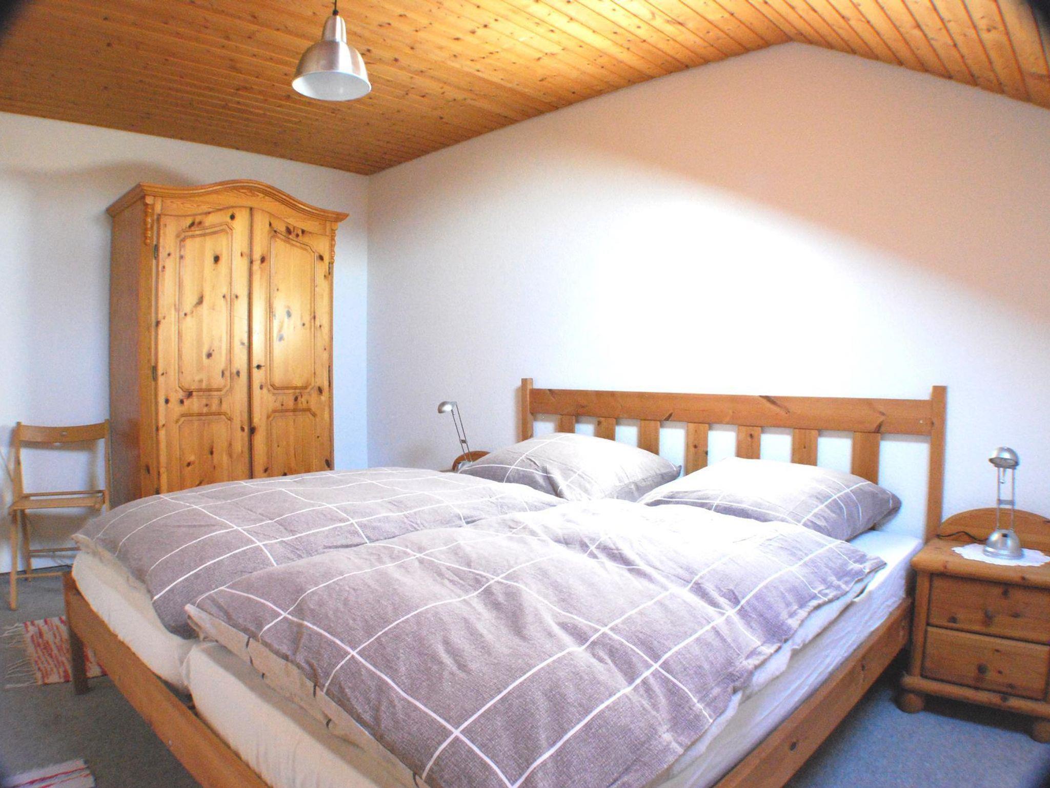 Dachwohnung mit großer Wohnküche, Spülmaschine, Wohnzimmer mit Sofabett, TV, Schlafzimmer mit Doppelbett, Badezimmer mit Dusche und WC, Sonnenbalkon, Zentralheizung.