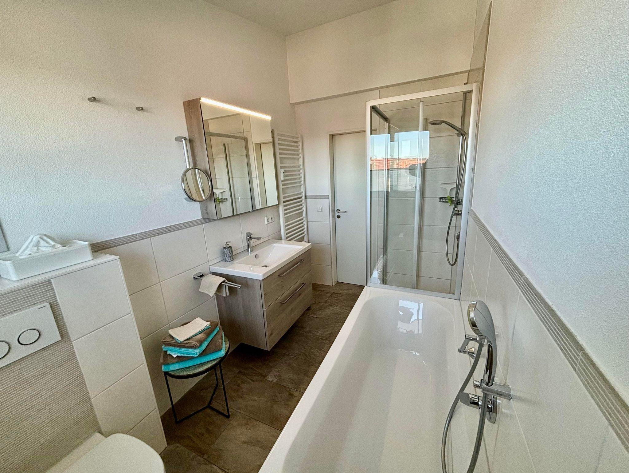 Neue Ferienwohnung mit gut ausgestatteter Küche, gemütlichem Wohnzimmer und Balkon. Separates Doppelschlafzimmer und neues Bad mit Dusche und Badewanne.