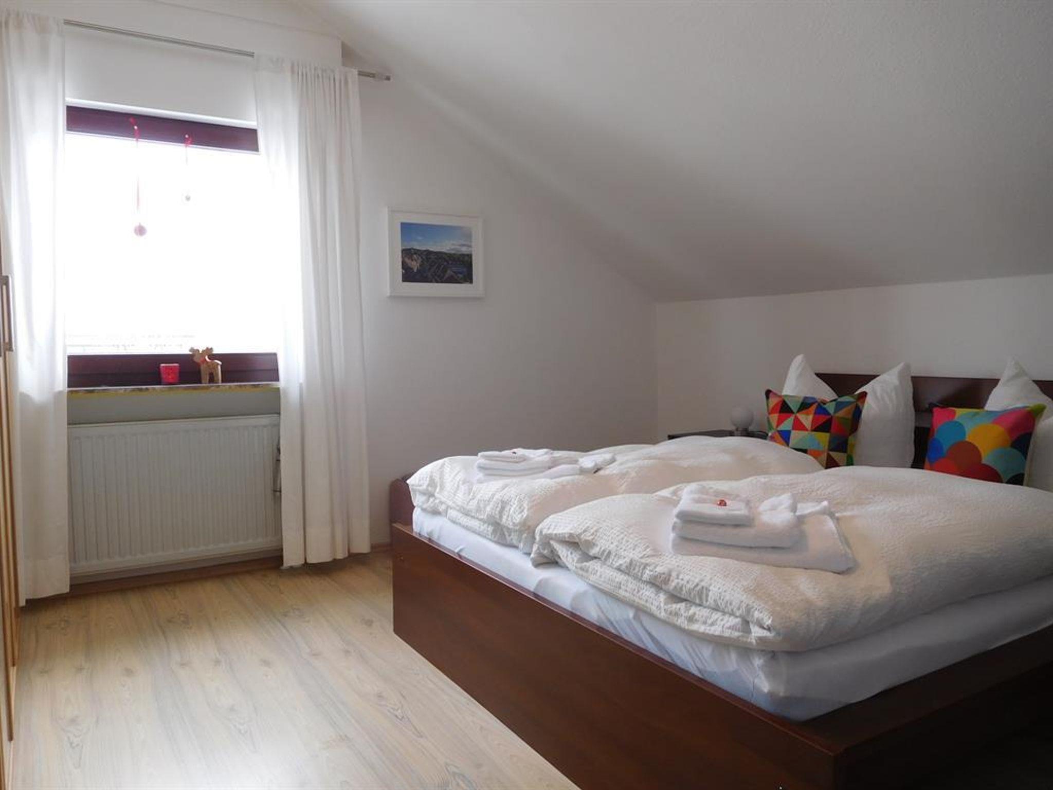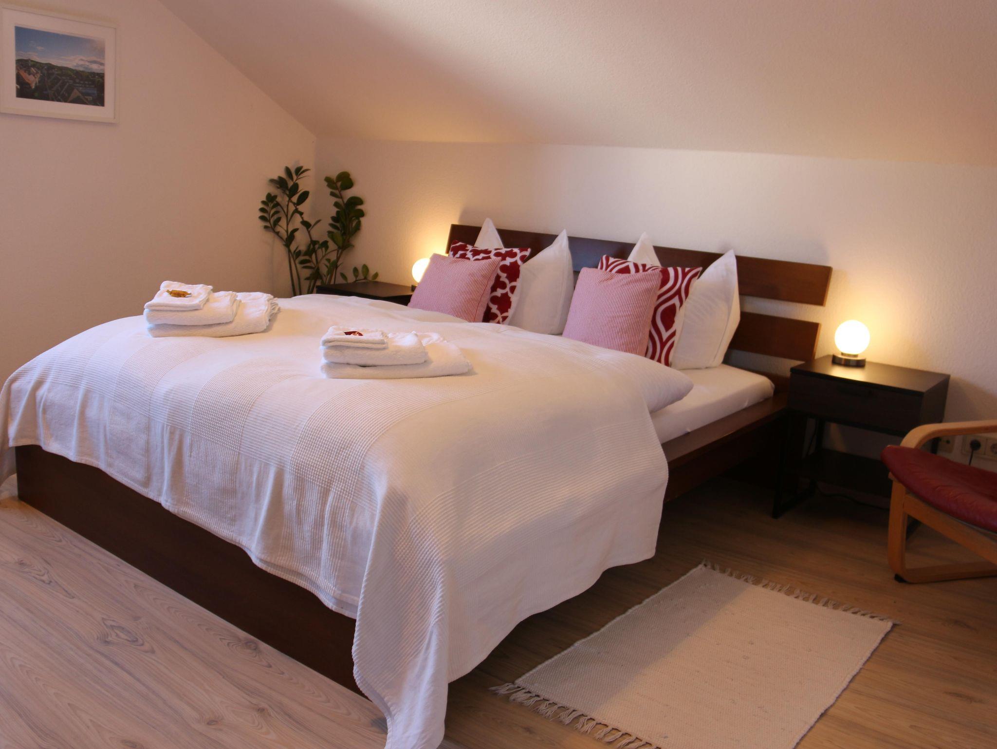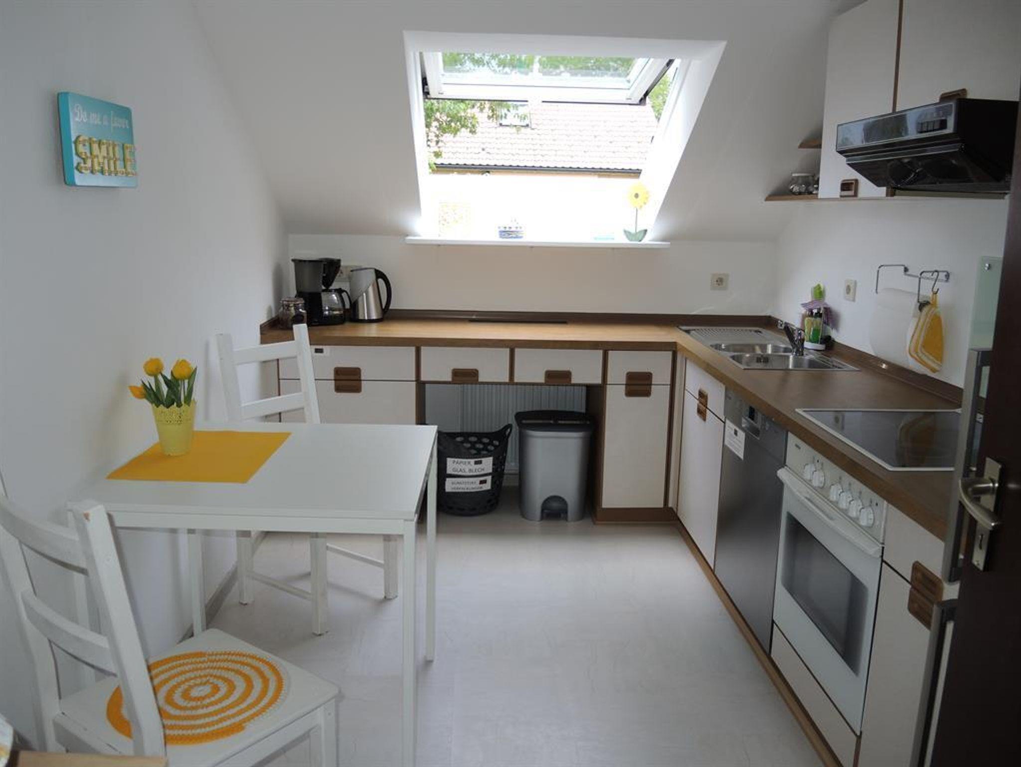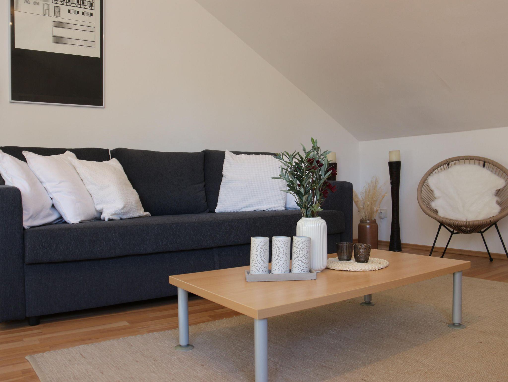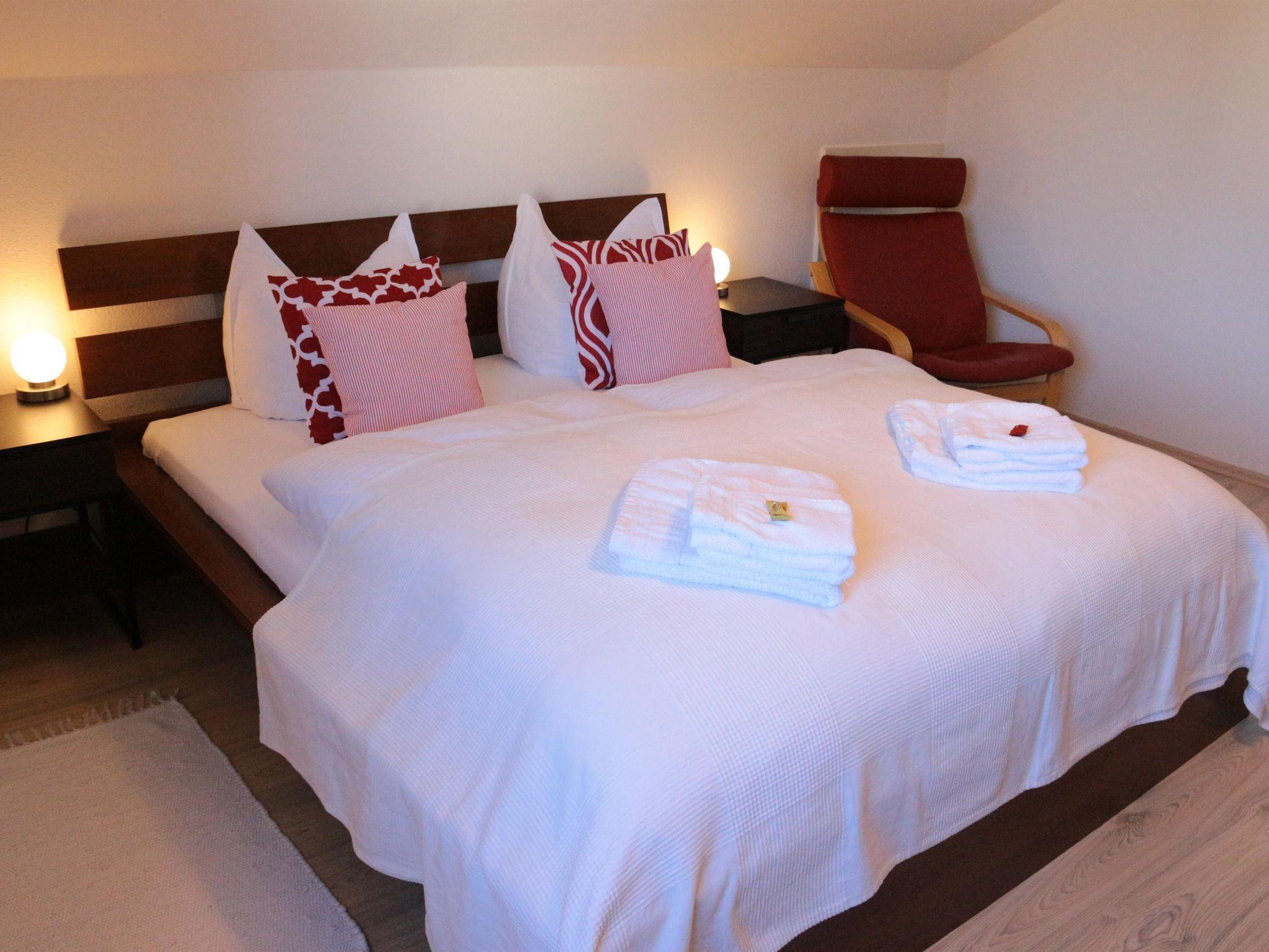 Gemütliche Wohnung mit 2 separaten Schlafzimmern mit jeweils einem Doppelbett; Helle, große Küche mit Spülmaschine und Mikrowelle, Badezimmer mit Dusche und WC, grosses Wohnzimmer mit Schlafcouch, Zugang durch ein abgetrenntes Treppenhaus ins 1.OG.