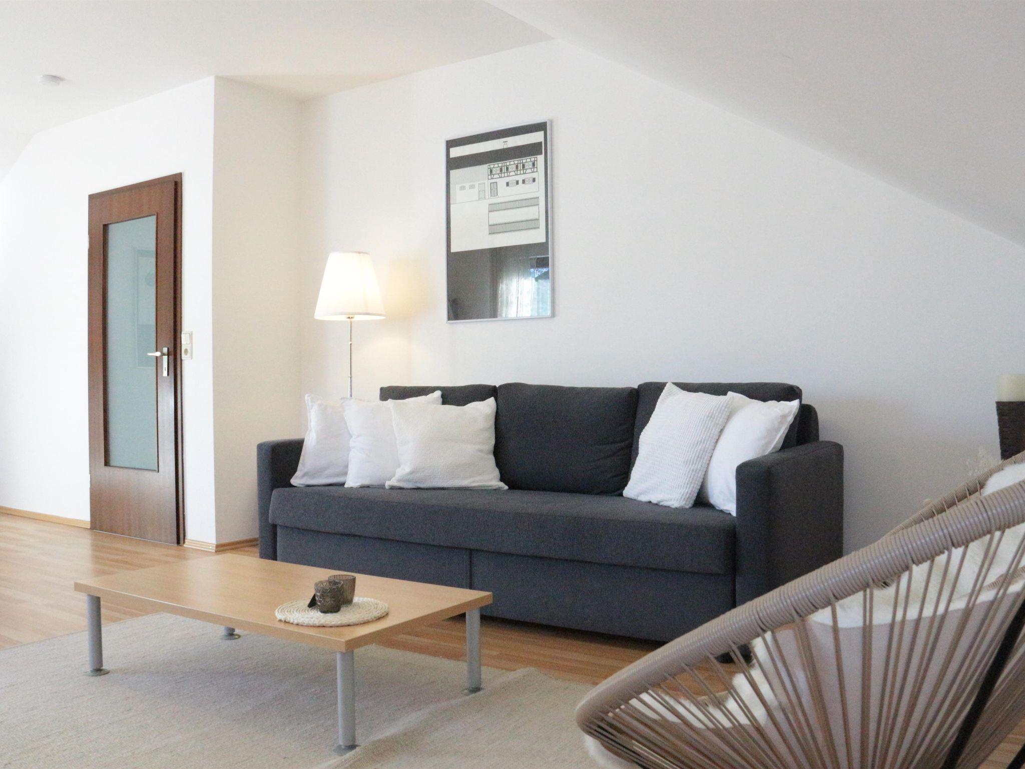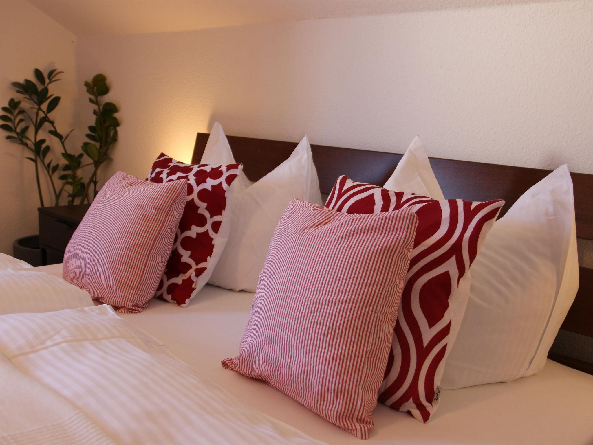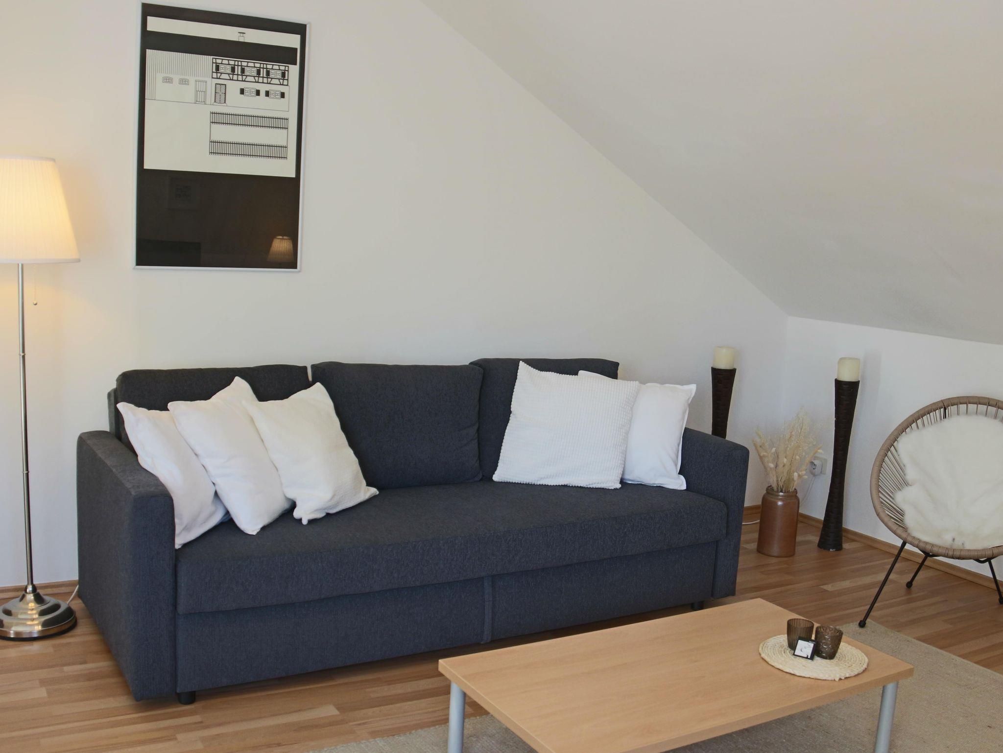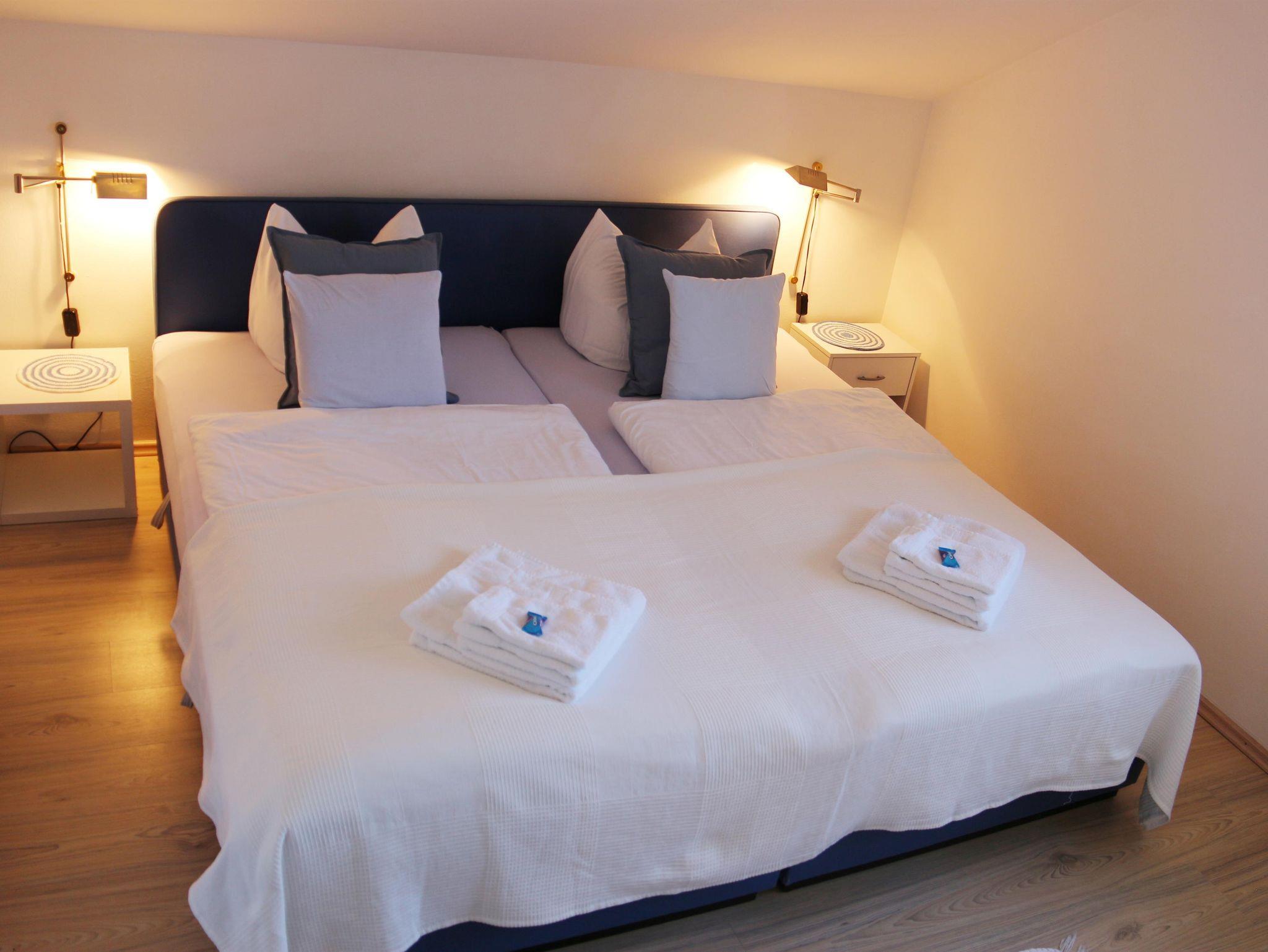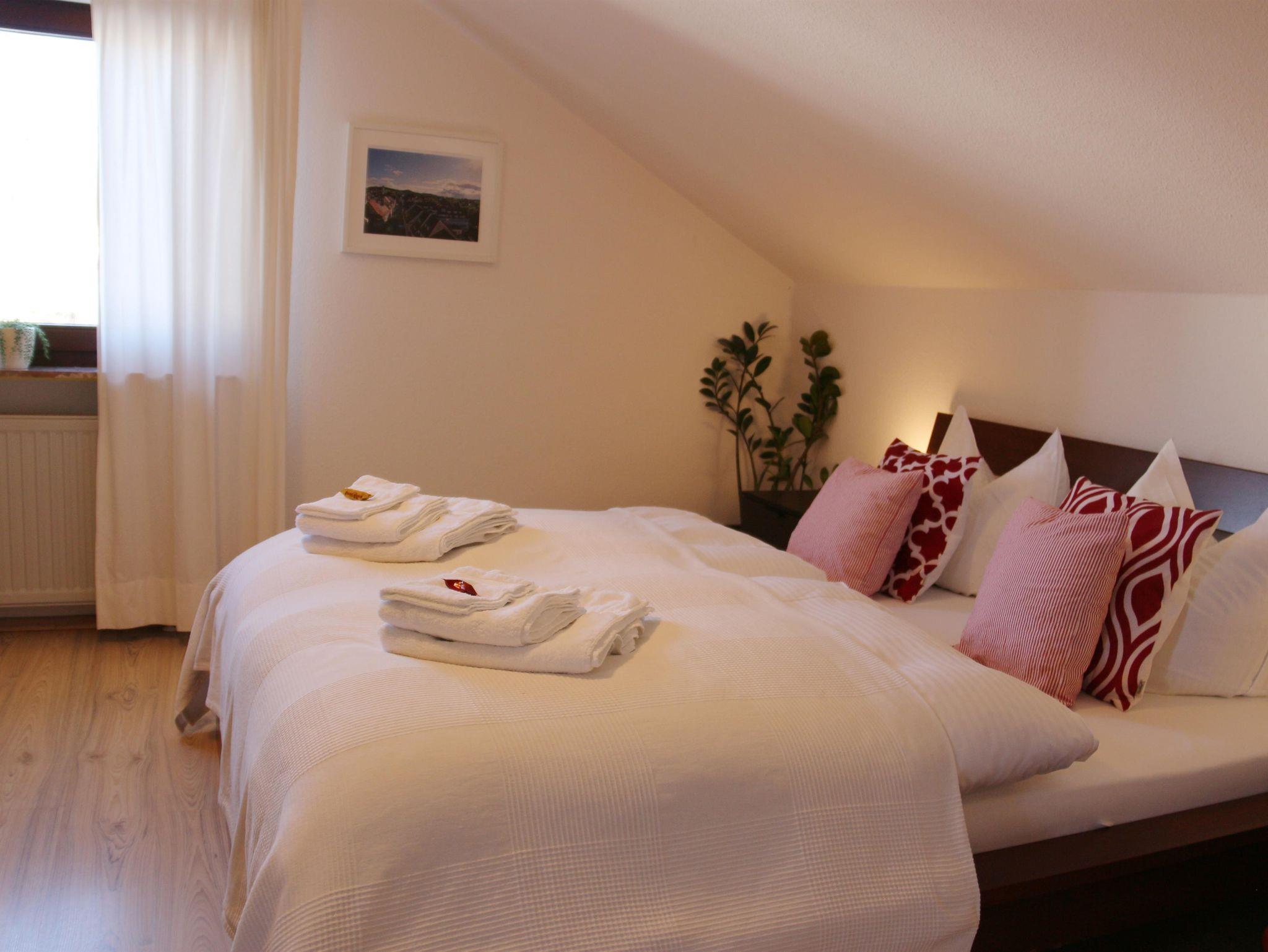 Gemütliche Wohnung mit 2 separaten Schlafzimmern mit jeweils einem Doppelbett; Helle, große Küche mit Spülmaschine und Mikrowelle, Badezimmer mit Dusche und WC, grosses Wohnzimmer mit Schlafcouch, Zugang durch ein abgetrenntes Treppenhaus ins 1.OG.