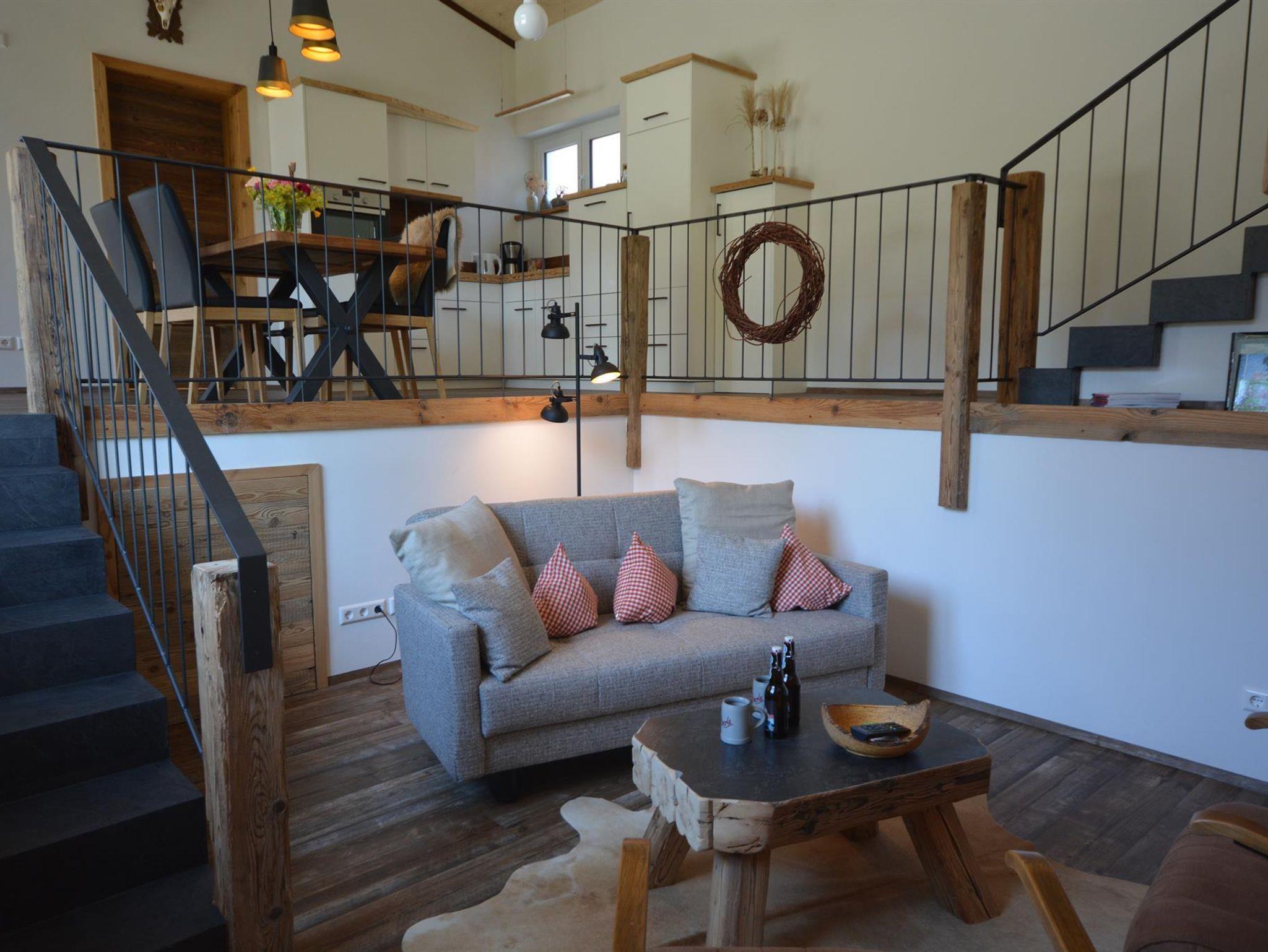 Rustikal und modern eingerichtete 4**** Ferienwohnung, 75m² auf 3 Wohnebenen, ruhige Lage am Ortsrand, eigener Eingang und Parkplatz, große Sonnenterrasse, perfekter Ausgangspunkt zum Spazieren, Wandern, Radeln, Langlaufen, Skifahren oder einfach Entspannen, Gartenhaus mit Elektroanschluss.