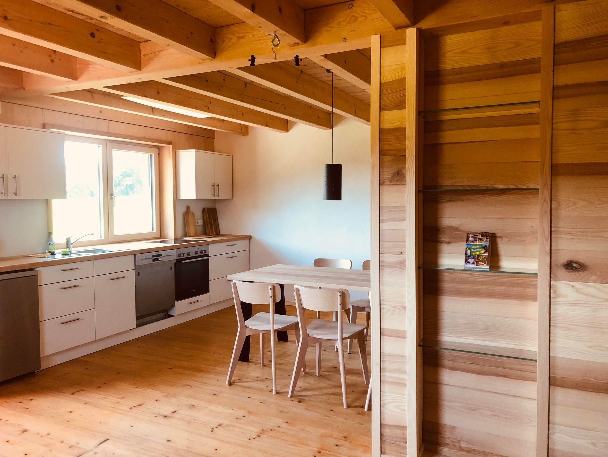 Großzügige 4-Zimmer Wohnung in ökologischem Massiv-Holzhaus auf Bioland-Heumilchbetrieb, idyllische und ruhige Alleinlage umgeben von wunderschöner Natur mit Blick auf die Alpen.
