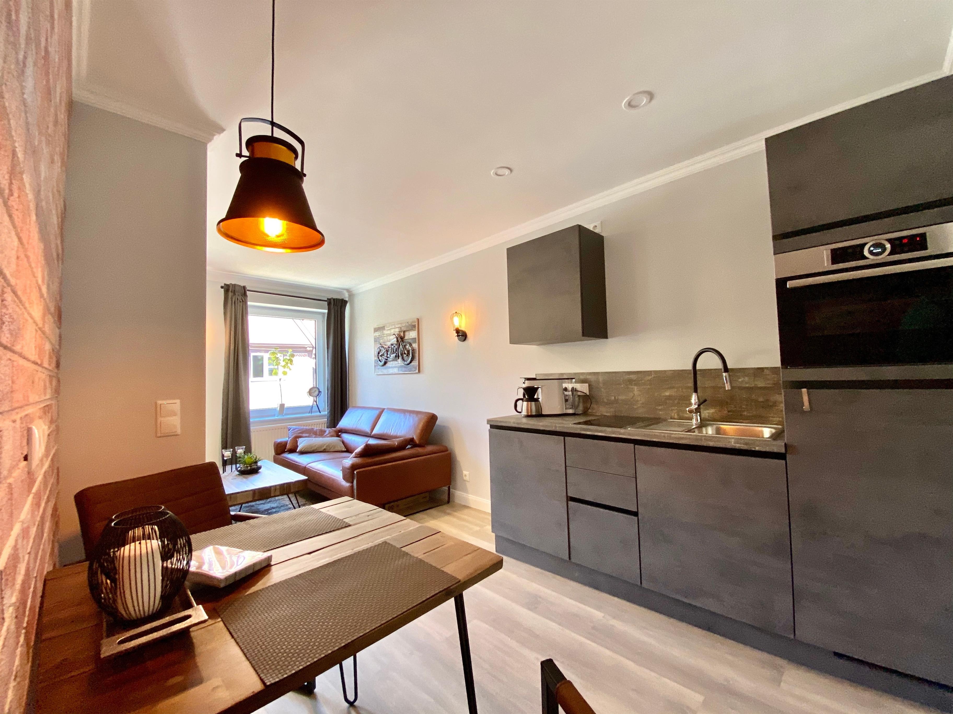 Das Appartement ist ausgestattet mit einem Doppelbett. Es erwartet Sie ein gemütliches Ledersofa, ein wunderschönes Badezimmer mit großer und bodenebener Dusche, eine Essecke und eine offene Küchenzeile mit einem 2-Platten-Induktionsherd, einem Backofen, einer Mikrowelle, einem Kühlschrank, einer Waschmaschine und den üblichen Küchengeräten und -helfern.