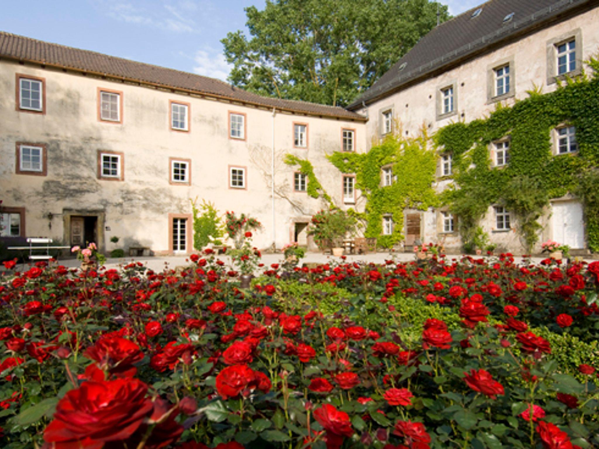 Hier genießen Sie den zauberhaften Blick in den Rosengarten im Innenhof, nach Nord-Osten zur idyllischen Flussbegrünung. Wer Glück und Muse hat, kann die Rehe über den Fluss springen sehen und sie beim Äsen beobachten.