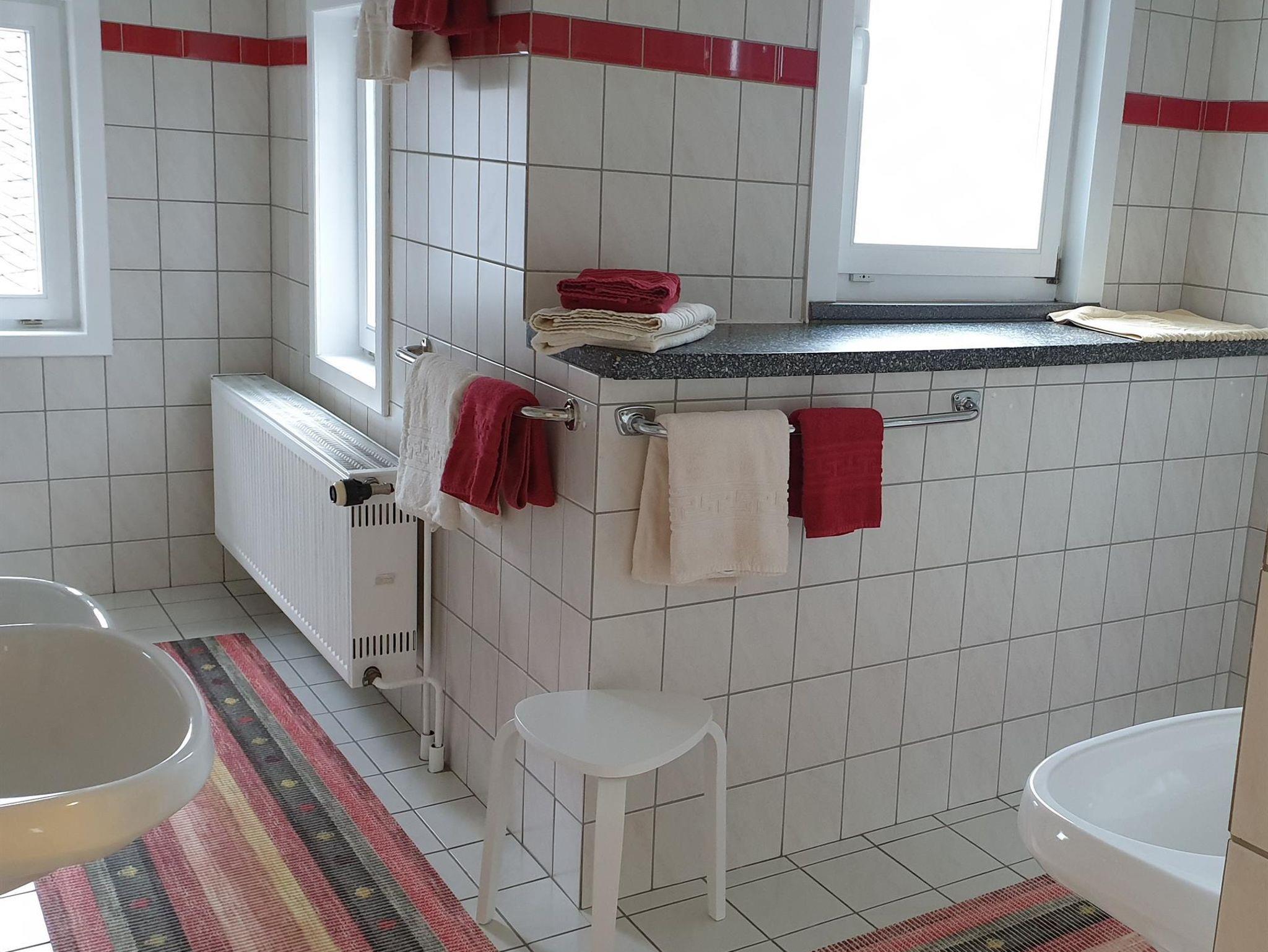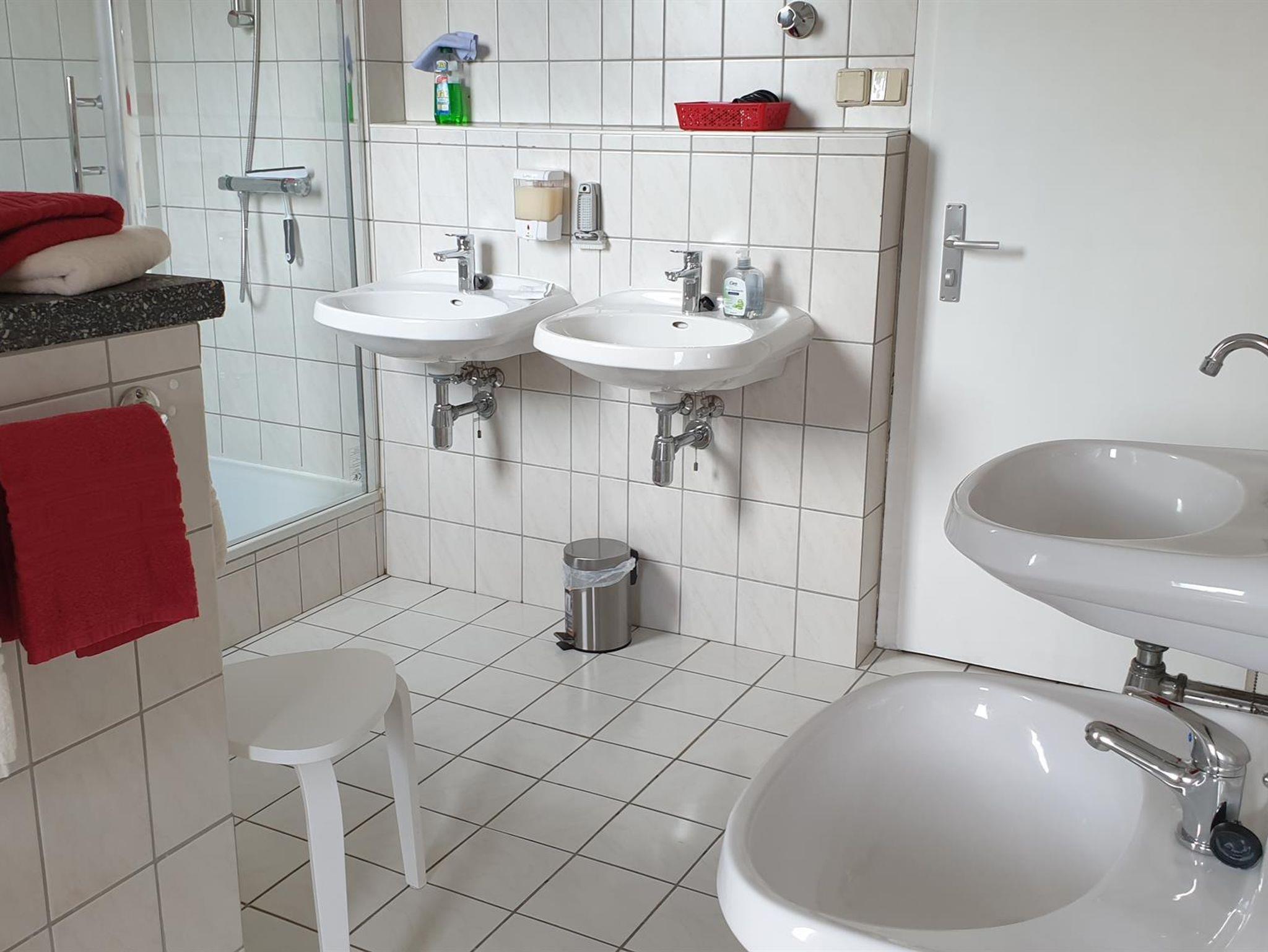 • Badezimmer mit 1 Dusche und 2 Toiletten im selben Raum getrennt durch eine Wand, 3 Wasch-/1 Kinderwaschbecken.