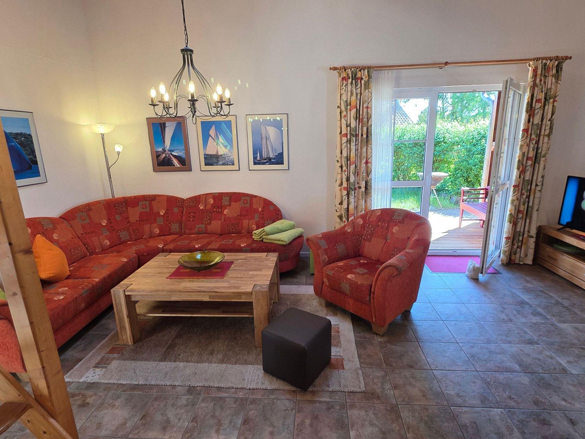 Das gemütlich eingerichtete Haus, im Landhausstil, verfügt über einen großzügigen Wohnraum mit Kamin und direktem Zugang zum Garten.