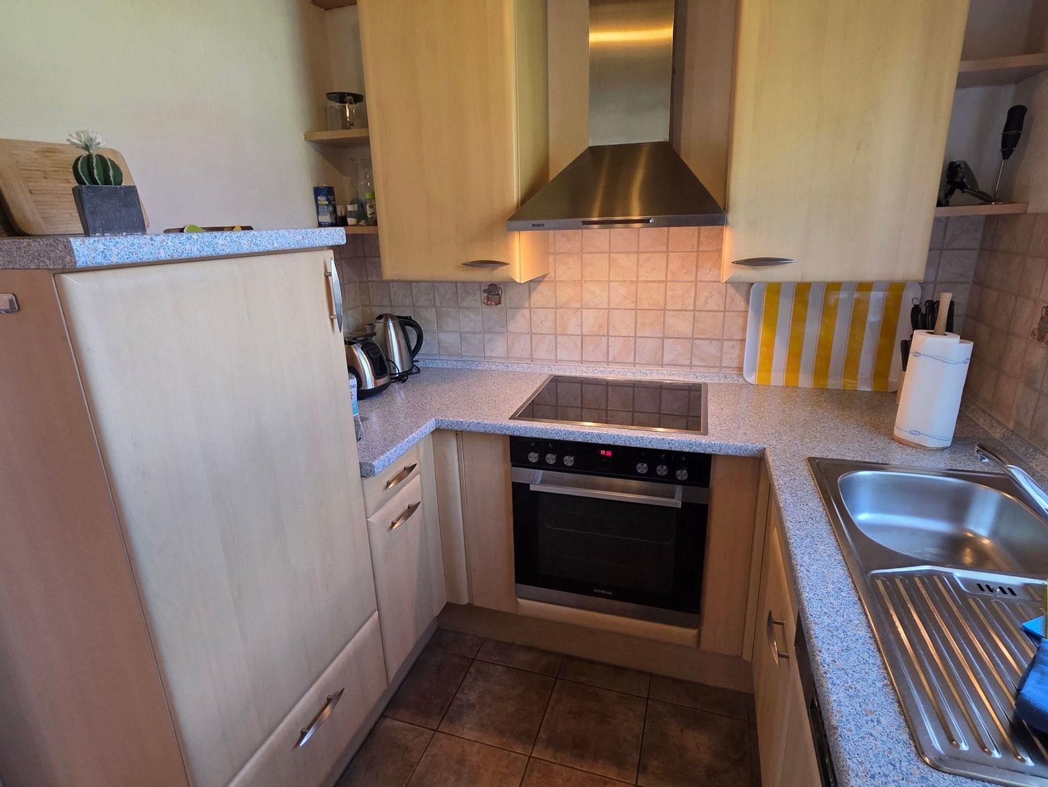 Die abgeschlossene Küche ist mit einem Geschirrspüler, Elektroherd, Backofen und Kühlschrank mit Gefrierfach ausgestattet.