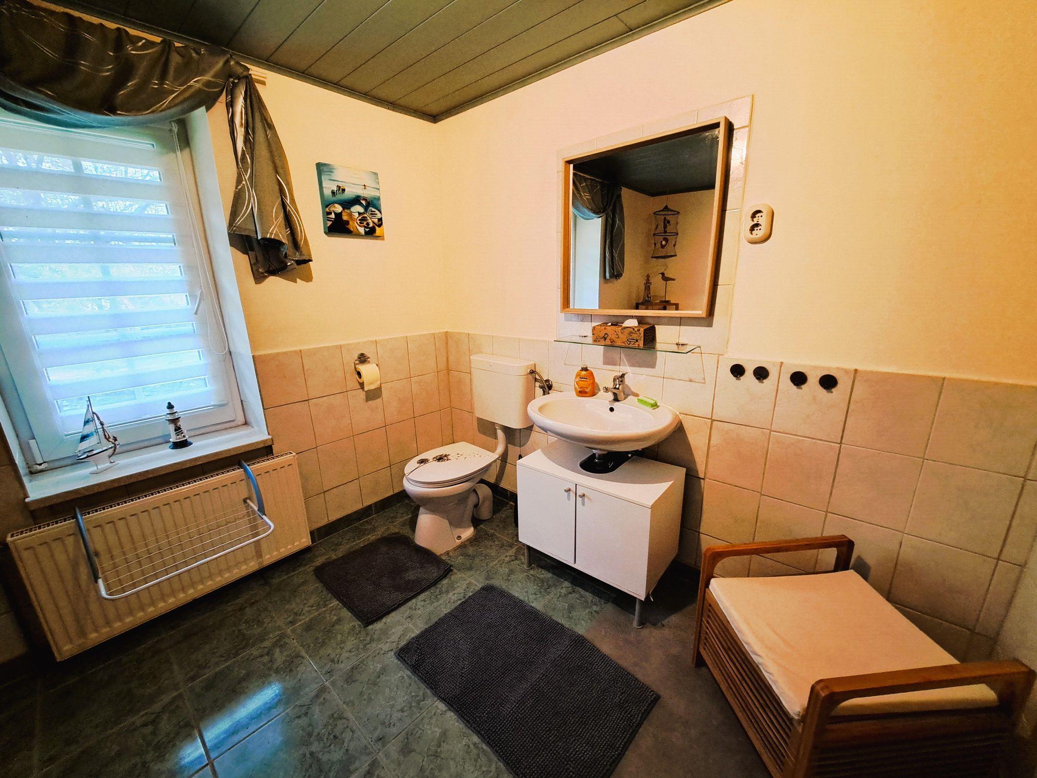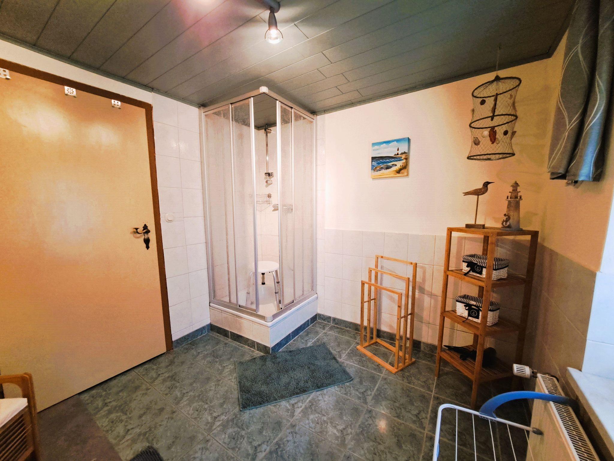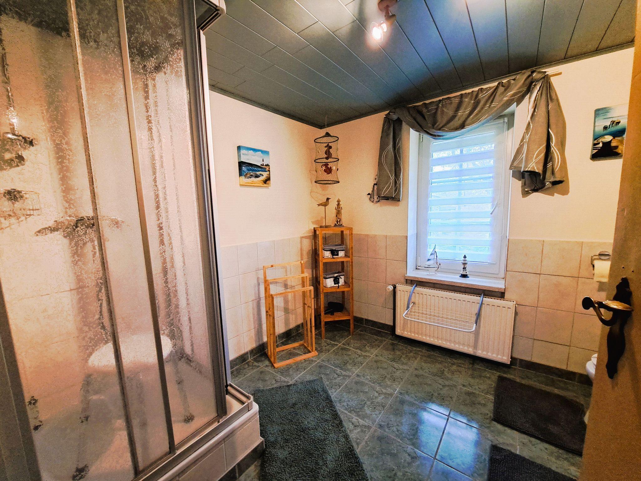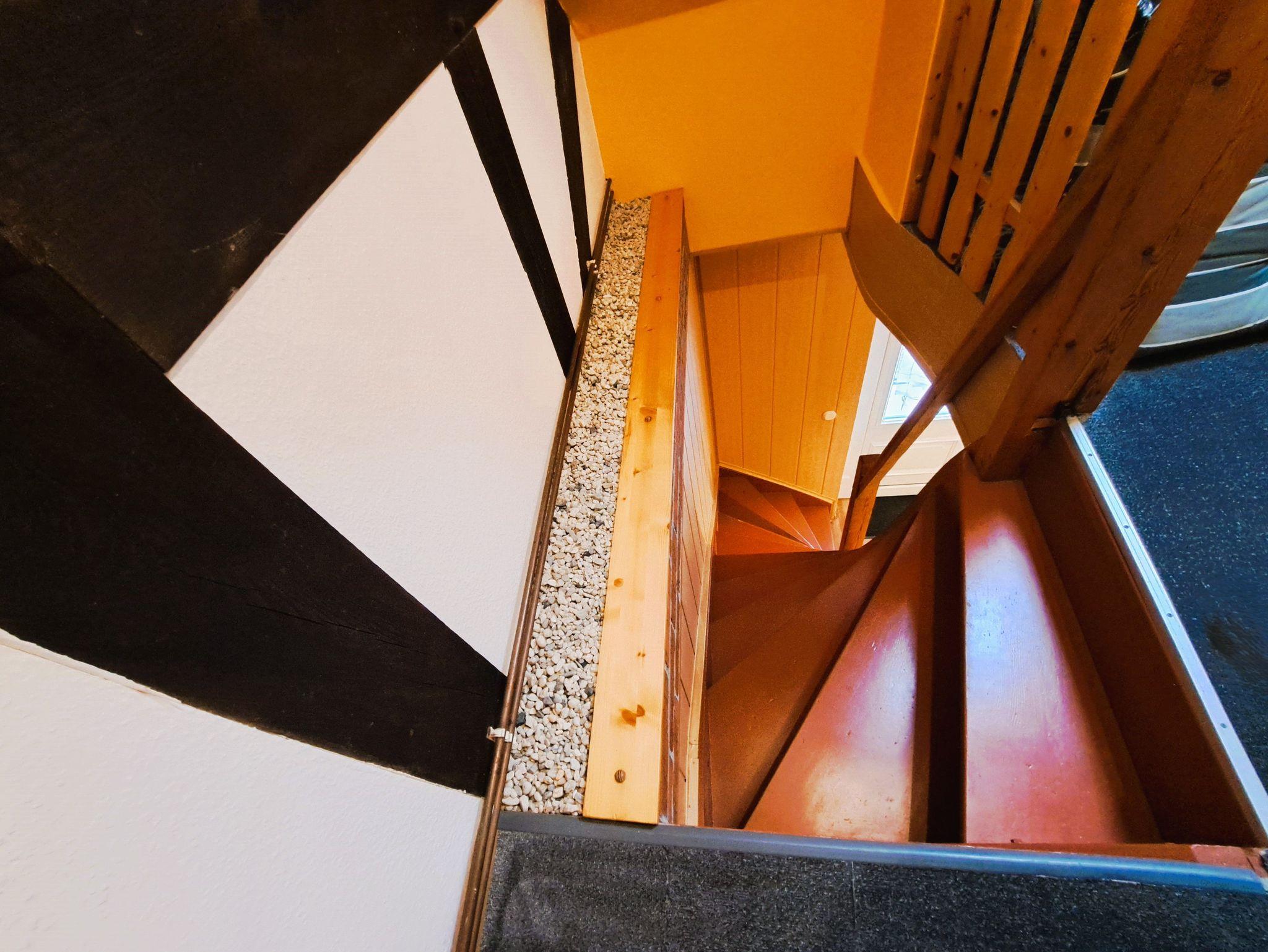 Das Tageslichtbad bietet eine erfrischende Dusche und ein WC, ideal für einen entspannten Start in den Tag. Nun führt eine Treppe mit 13 Stufen hinauf in den ersten Stock. Die Treppe ist leicht steiler, was dem historischen Charme des Hauses entspricht, aber dennoch bequem zu begehen ist.