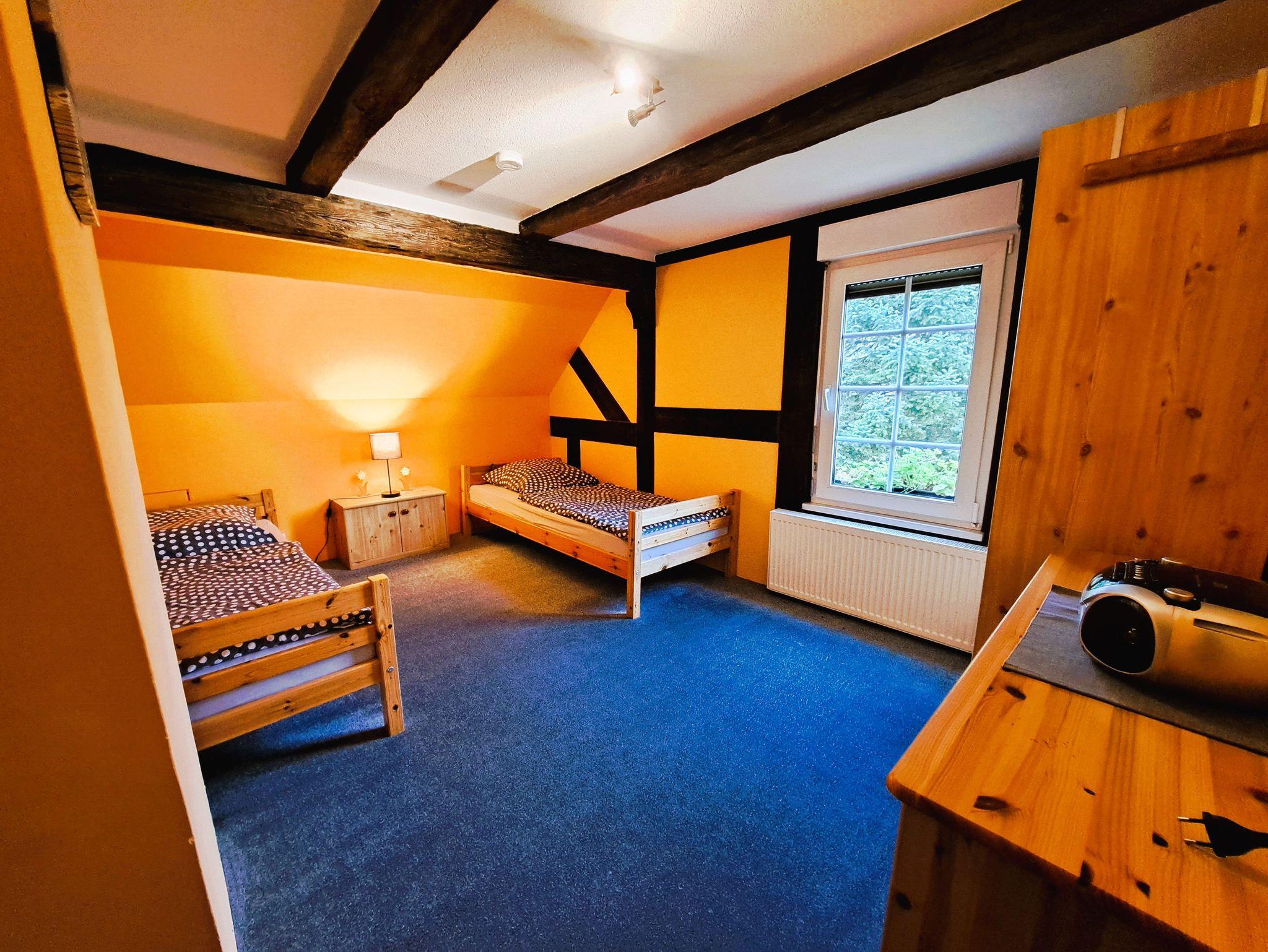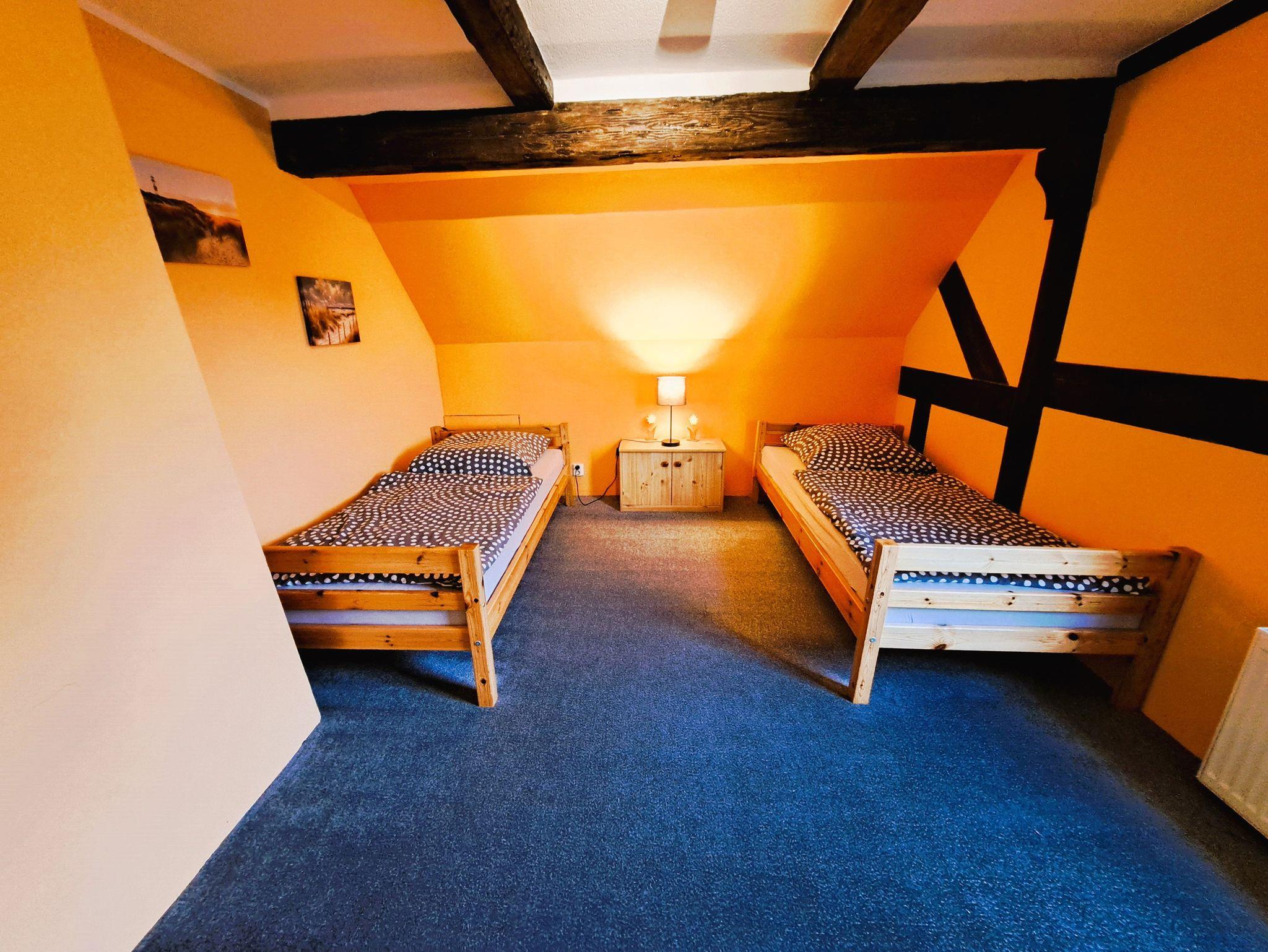 Im 1. Obergeschoss erwartet Sie ein Schlafzimmer mit zwei Einzelbetten, einem Kleiderschrank und einem wunderschönen Ausblick auf die nahegelegene Kirche. Das zweite Schlafzimmer verfügt über ein gemütliches Doppelbett und einen Wohnbereich mit Couch und TV ? perfekt für entspannte Stunden. Die liebevolle und bunte Ausstattung sorgt für eine heimelige Atmosphäre, in der Sie sich sofort wohlfühlen werden. Zum Treppenabgang ist ein Kinderschutzgitter installiert.