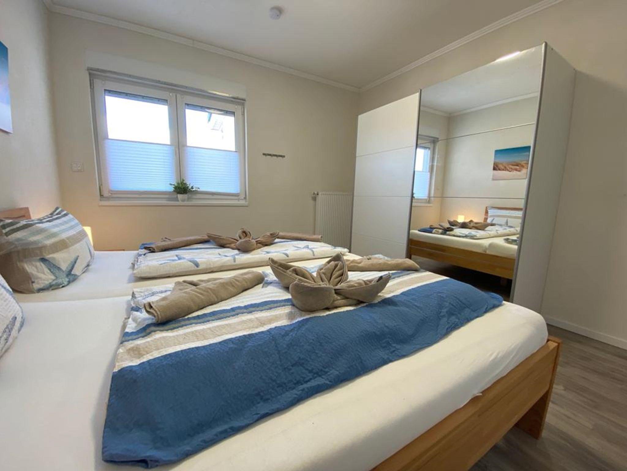 In den zwei separaten Schlafzimmern je mit Kleiderschränken finden bis zu 5 Personen Platz. Ein Schlafzimmer ist mit einem Doppelbett, das andere Schlafzimmer mit zwei Einzelbetten versehen. Eines hat eine voll ausziehbare Unterbettkommode.