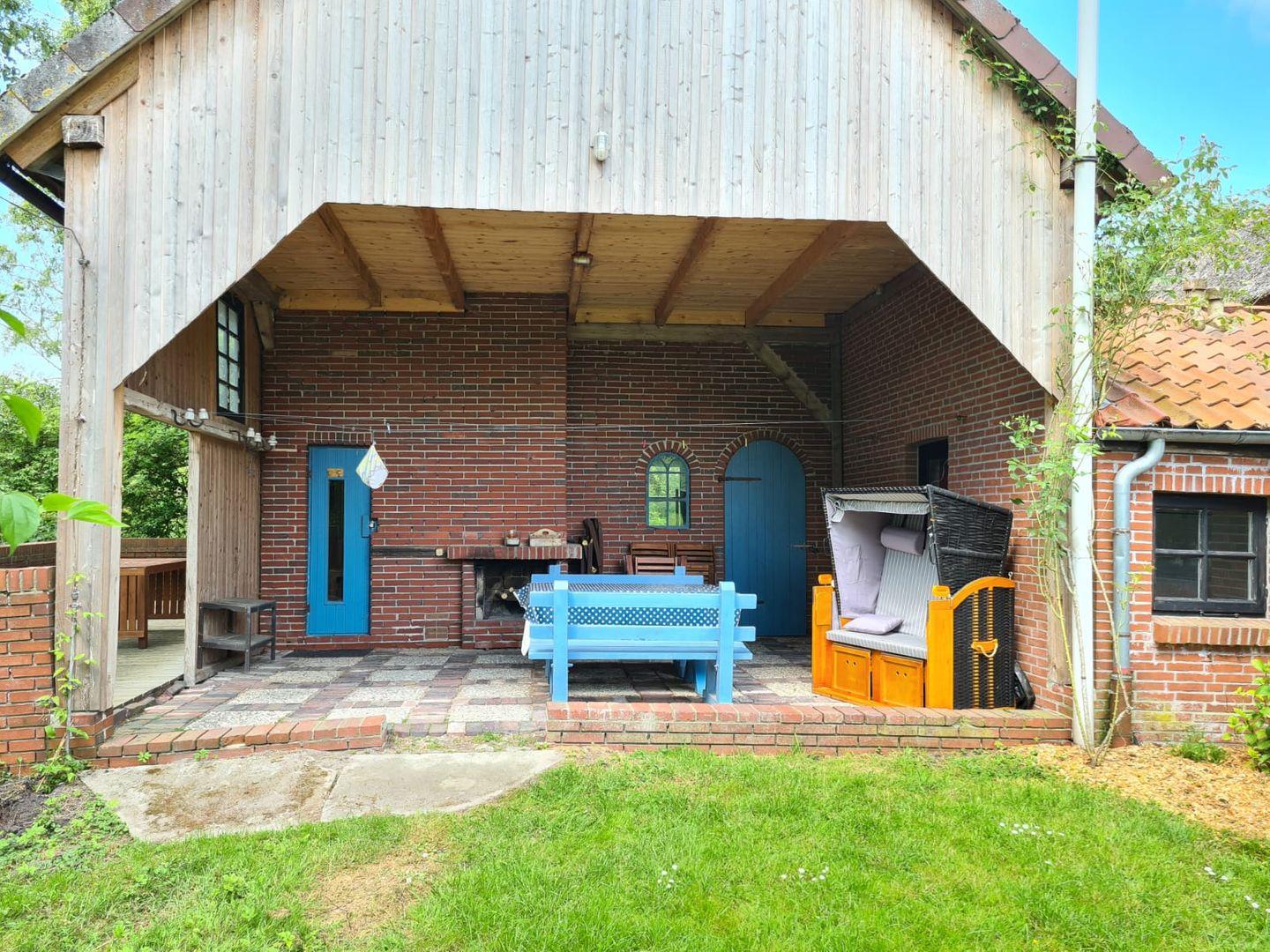 Eine vom Schuppen überdachte Terrasse erlaubt ihnen bei jedem Wetter draußen zu verweilen und die Natur zu genießen.