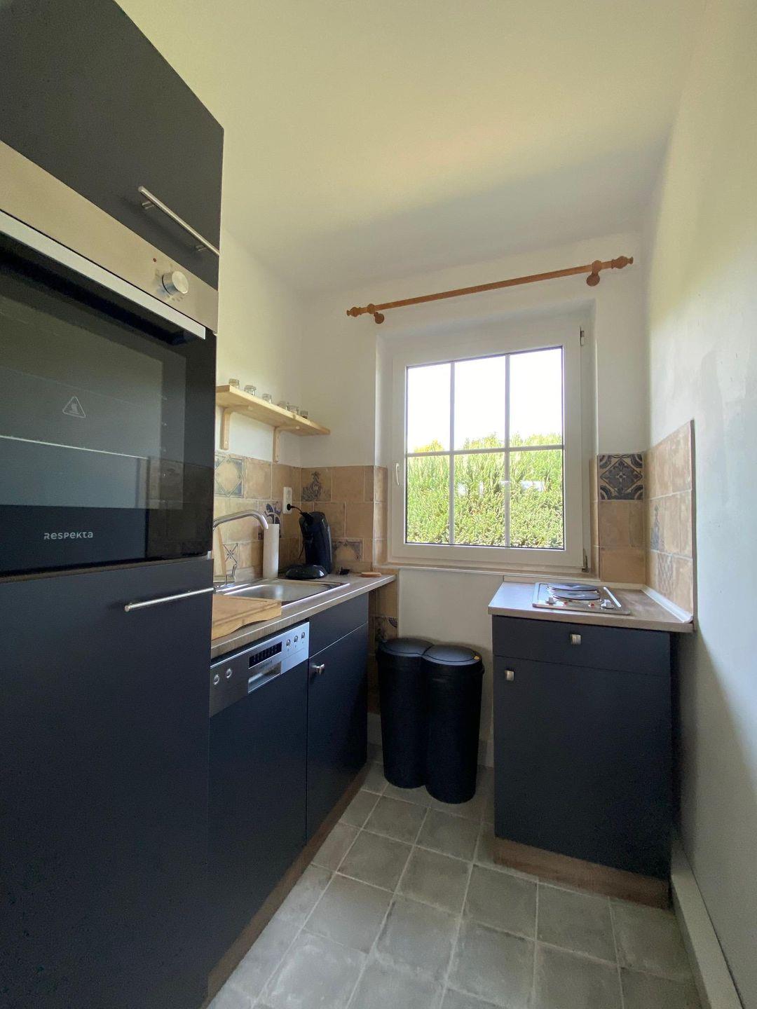 Die Küche mit moderner Küchenzeile ist ausgestattet mit Kühlschrank inklusive Gefrierfach, Backofen, Kochplatten, Spüle und Spülmaschine.